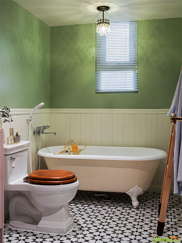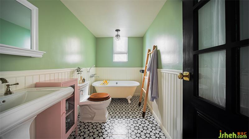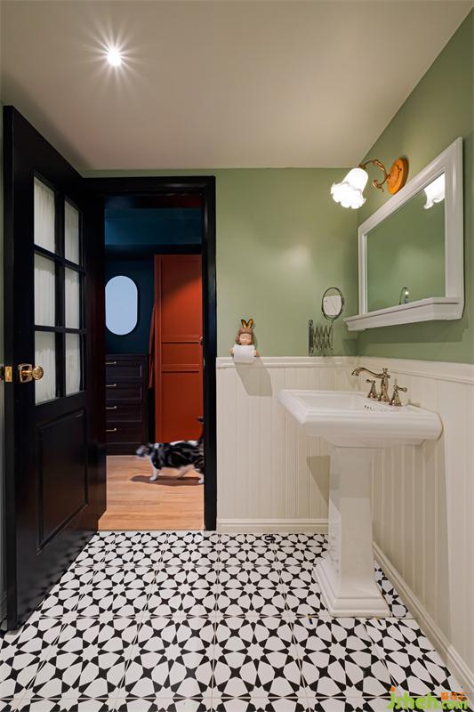 卫生间采用墙裙+彩色漆面的搭配,再配合复古洁具,这样的搭配让空间看起来更加富有历史感和神秘感。