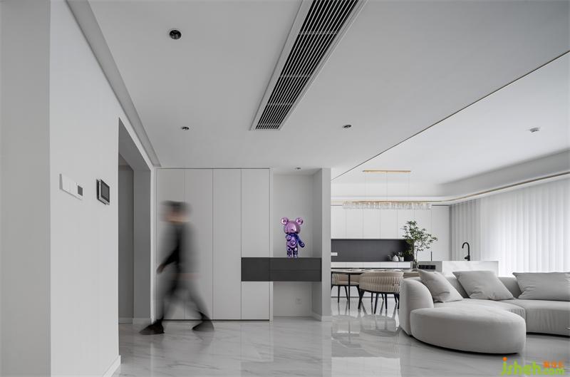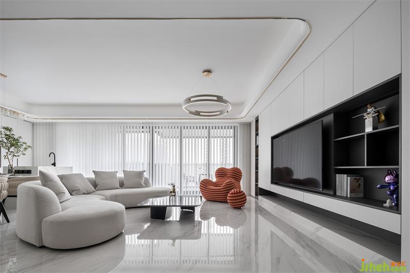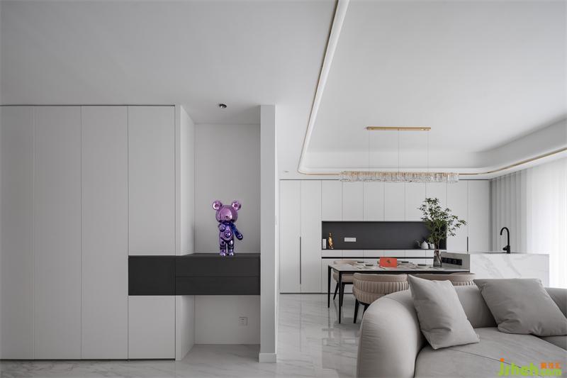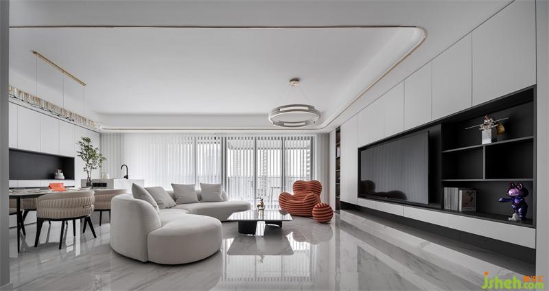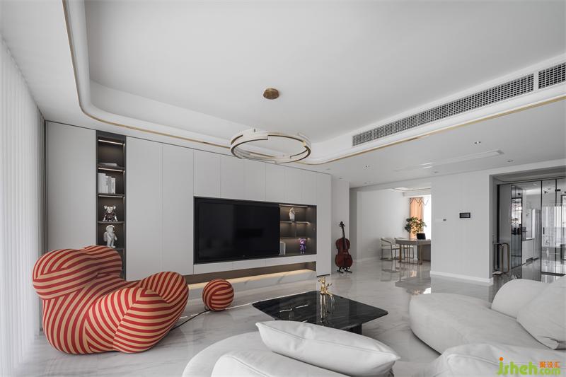 减少了隔断的阻碍,让空间更为宽敞通透,延伸感更强,嵌入电视背景墙与柜体结合,延展客厅整体空间。