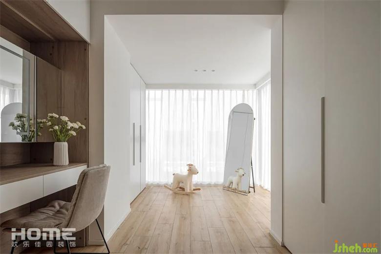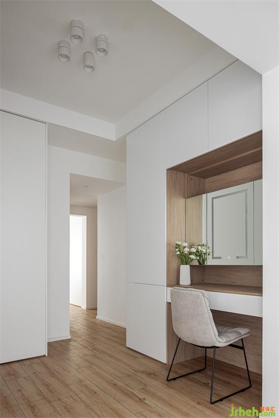 家装设计将原本次卧室打通增加衣帽间,同时让空气对流增强,也使得空间的使用范围增强!家装设计从家具到艺术摆件贯穿其中,占据了客人的视觉细胞,边角闪现精致。实木家具与白色空间,引领了一种新型的生活方式。