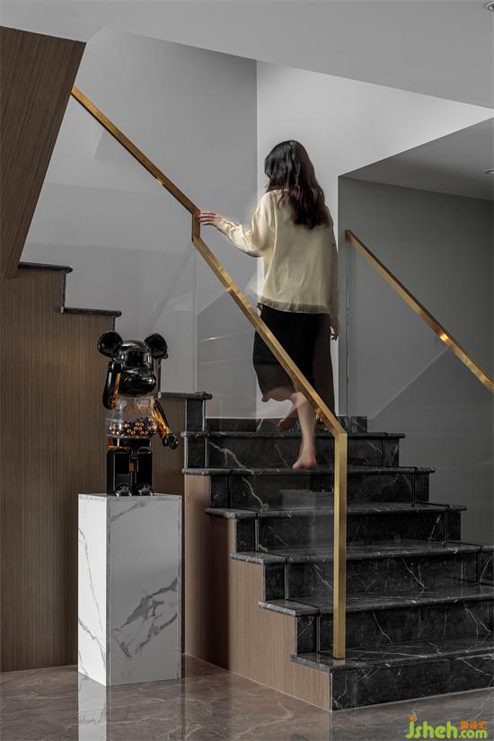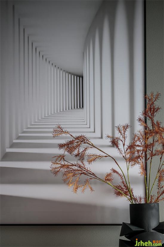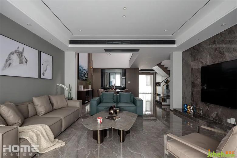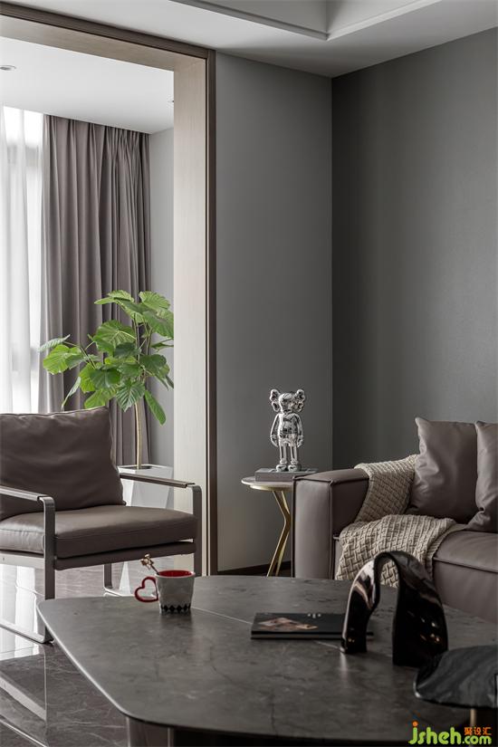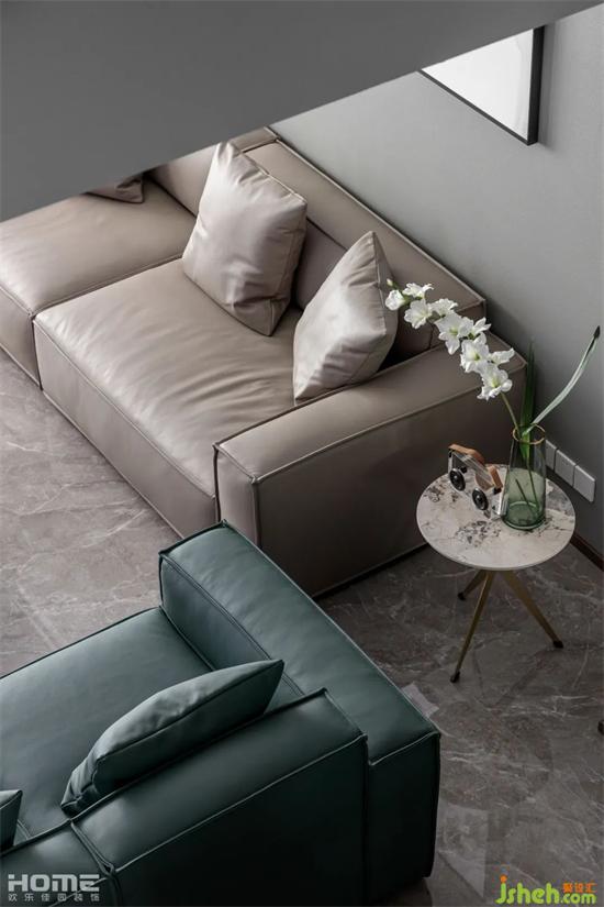 客厅采用无主灯设计,避免用吊灯会使空间感压抑,墙面使用艺术涂料,增强空间高级感。