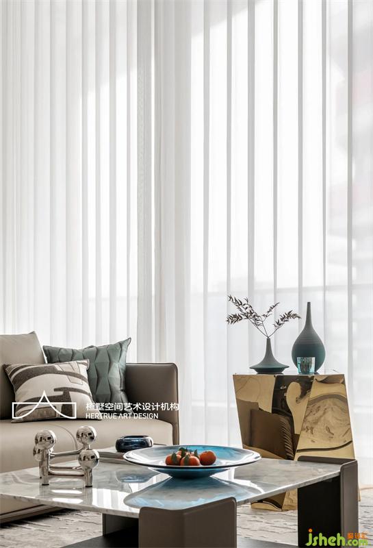 步入客厅,优雅的场景、细腻的色彩、轻柔的光线,勾勒出空间极致温柔的一面。流动的蓝色化为音符,在壁挂、抱枕、摆件之间起伏跳跃,将空间凝结成一首协奏曲,熠熠生辉、灵动悠长。
