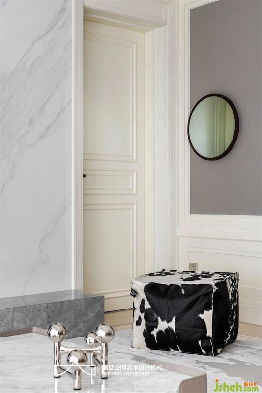 因此除了在硬装立面的一些简单调整外,软装没有选择过于跳跃,而是尽可能迎合现有状态去做到一个最恰到好处的融合,延用硬装已经运用到的色彩配比关系把软装主体链接起来,相互融合呼应,主体家具均采用纯色色块形式,干净大气。