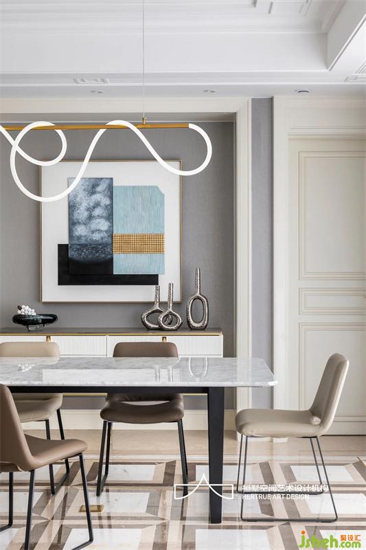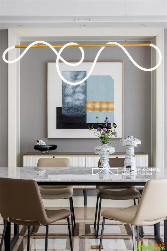 一幅拼接绘制的装饰画,让简约的餐厅多了一份舒爽明净。当细密的光线铺满整个餐桌,美好的感受一触即发。