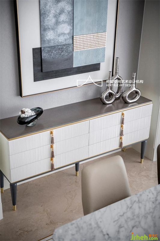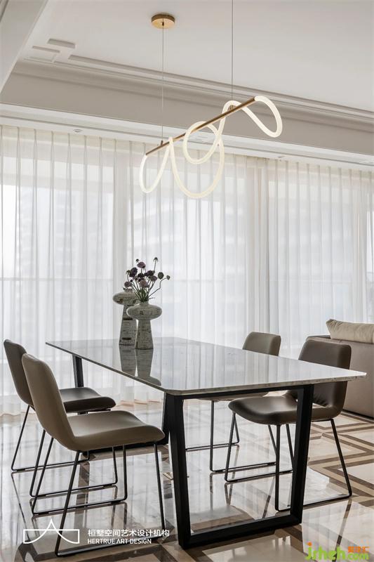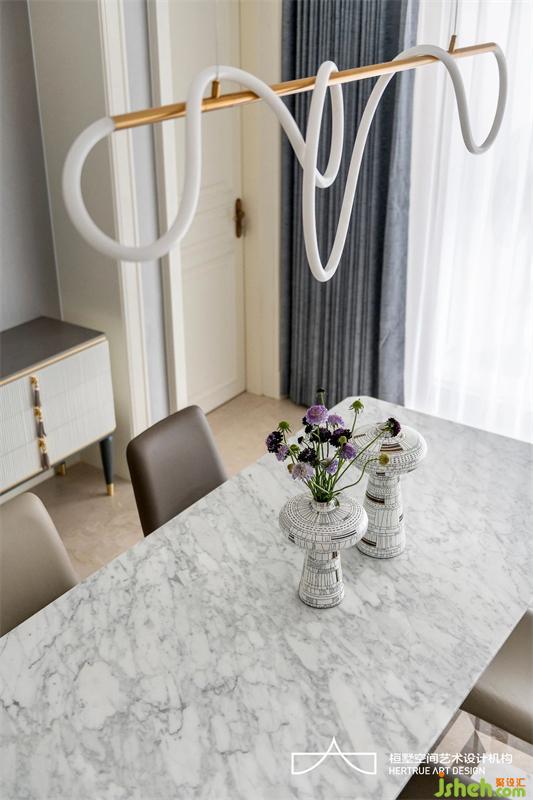 柔灰大理石餐桌勾勒出生活的质感与品位,独特花器里一抹绿意悄悄绽放,金属异型吊灯的点缀让静谧的空间泛起涟漪,一日三餐,安适如常。