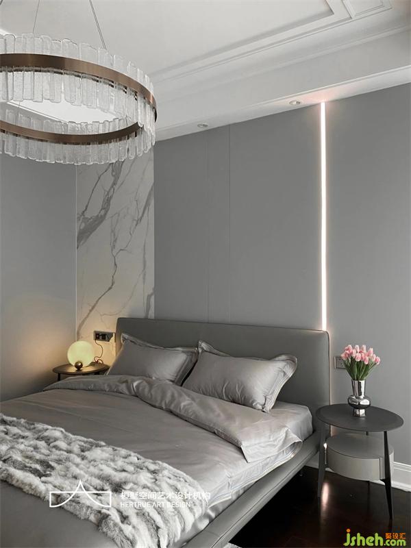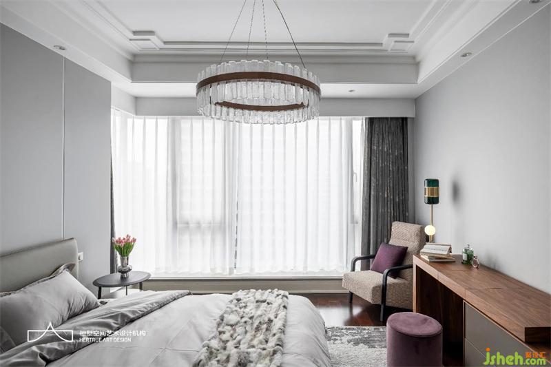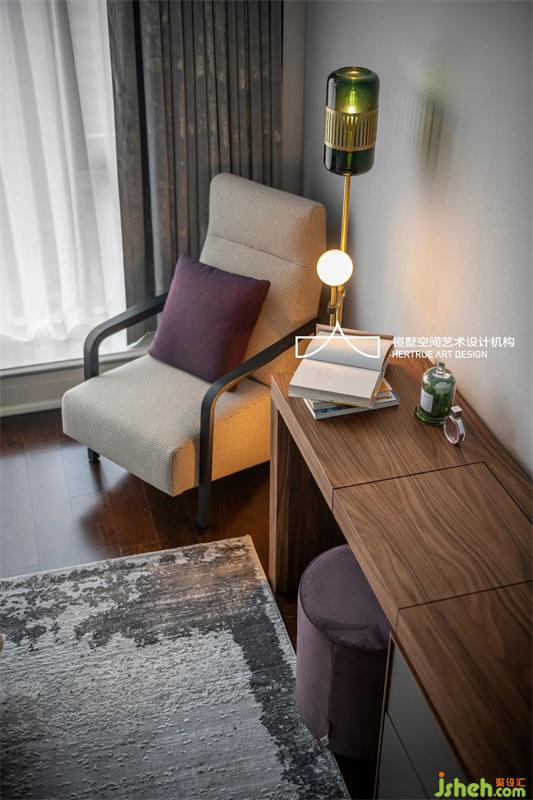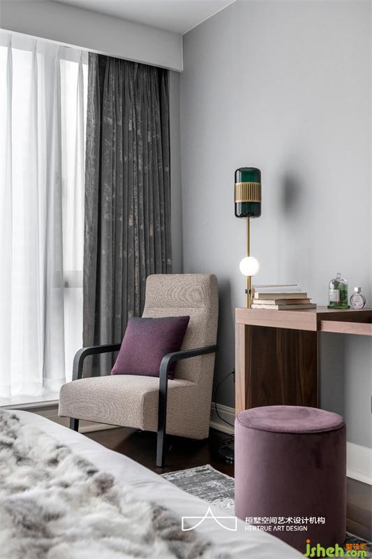 步入主卧,温润内敛的陈设美学于此间彰显。灰色调赋于空间时尚的特性,让人感受到对色彩与肌理的独特把握方式。紫色梳妆凳和抱枕,为此增添一抹跳跃因子,柔和优雅的活力迸发而出。