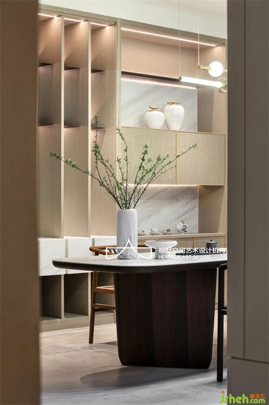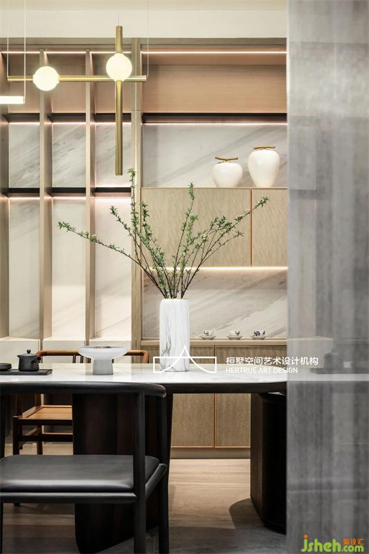 将中式线型留白意境重新组织语言,巧妙修饰大型承重柱并起到修平原来土建墙面基础的严重错位不平整。