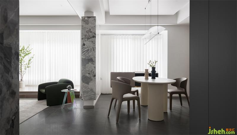 客餐厅作为一个联通的空间,硬装的整体平面布局上奠定了不拘一格的风格基础;软装选样上,餐桌打破传统餐厅的方正印象,柔和明媚的餐厅空间赋予就餐时的好心情.