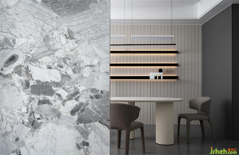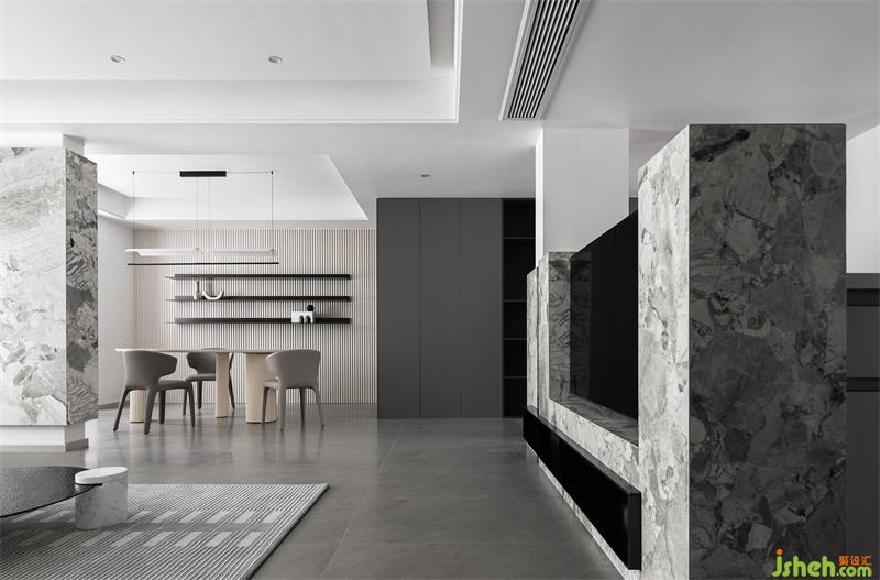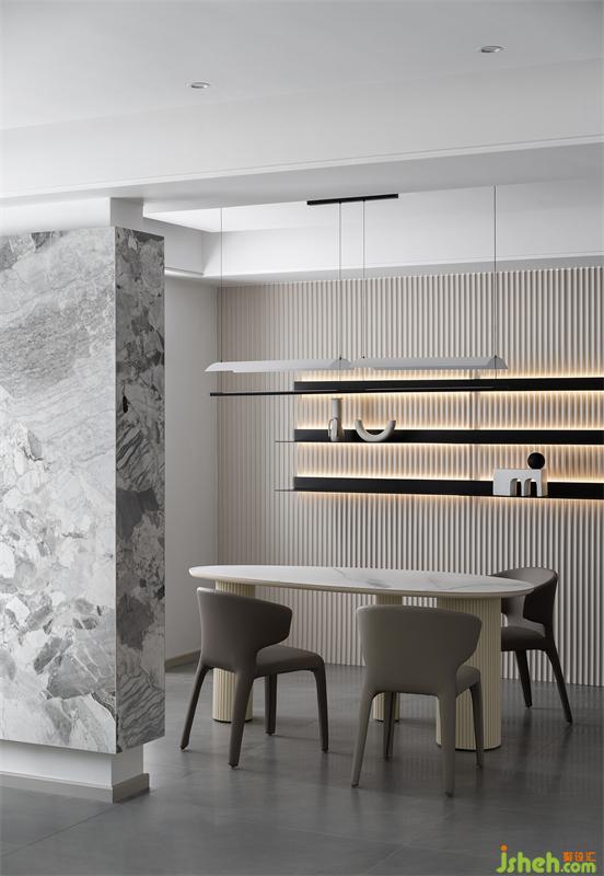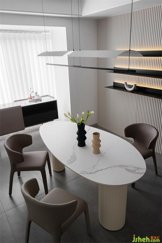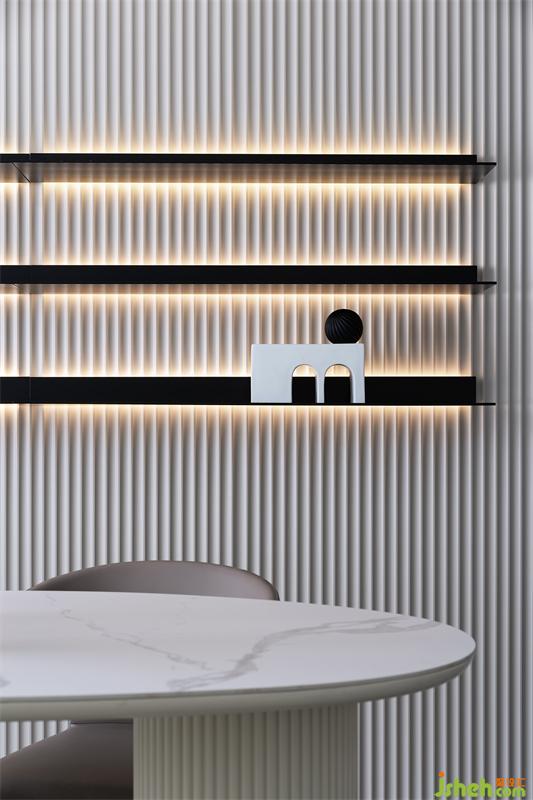 同时,与餐厅背景墙的发光搁架和格栅板相得益彰,让没有就餐的环境下,融合成为客厅装饰的一部分。