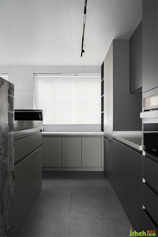 纯净的白、雅致的灰,精心控制的不同明暗的中性色彩,在彼此的起承转合间将厨房吧台区演绎成一场艺术展。