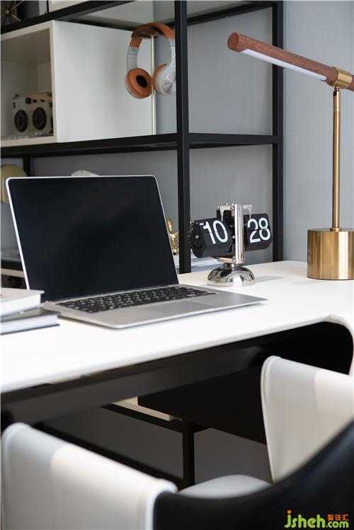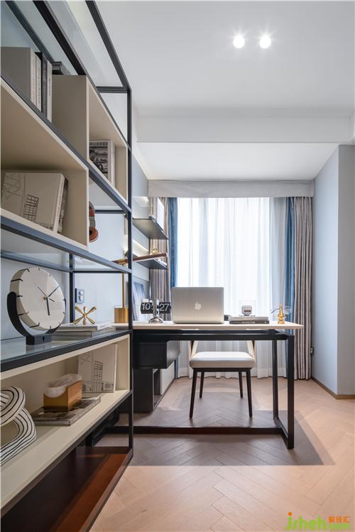 书房是多功能房,与主卧连通,也可以用作衣帽间。装修延续整体风格,简约干净。桌案及书架主体骨架上的黑色极简线条,穿插交互,构成空间冷静、沉稳的气质。于此,伏案或沉思,与自我和解,与世界对话,人生的迷思豁然开朗。
