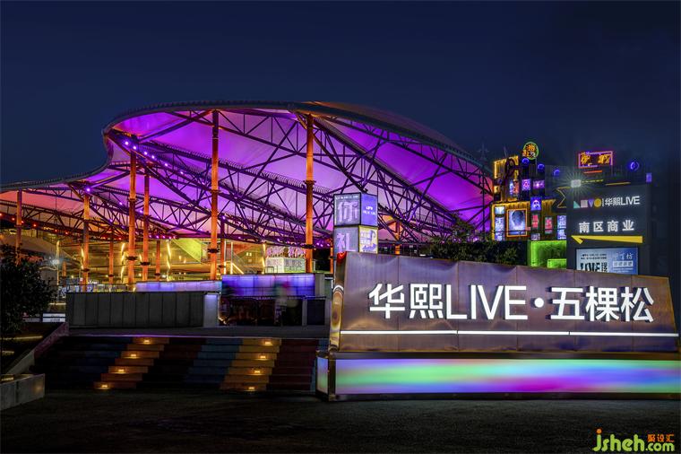 北侧入口的巨大张拉膜结构在夜色中被彩色灯光映照得如梦似幻,创造出充满未来感的视觉体验。灯光设计醒目而炫酷的“华熙LIVE·五棵松”品牌标识牌通过光影设计和结构布局与现场的氛围亮化彼此衬托,共同营造出商业之美,进一步提升了访客对这个潮流商业品牌的认知。