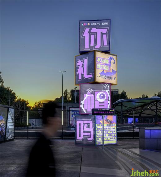 南侧入口矗立着由立方体堆叠而成的导视塔,立体造型赋予标识牌雕塑般的美感。塔上的每一面传递出不同信息,明亮色彩和趣味文字增强了信息传达的有效性和辨识度。
