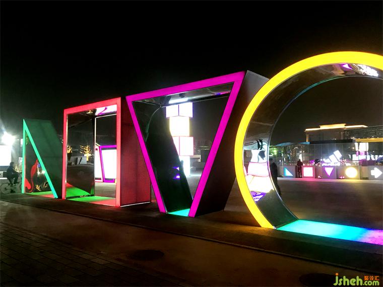 由“华熙LIVE”logo演化而来的互动装置进一步强化了品牌视觉。几何轮廓的内侧是哈哈镜,当行人穿过时可以看到自己的变形影像。同时,底部的触感式灯箱也会发出光亮进行互动,提升了现场体验的乐趣。