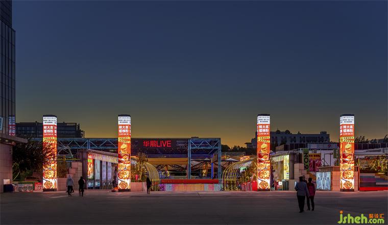 东坡道入口以四根高耸的广告柱为标志,鲜艳的广告画面和霓虹灯光形成强烈的视觉冲击,灯光设计作为商业区域与场馆区域的分界线。黄昏时分,落日余晖与霓虹灯光交相辉映,使街区成为城市夜晚的焦点。