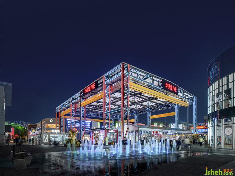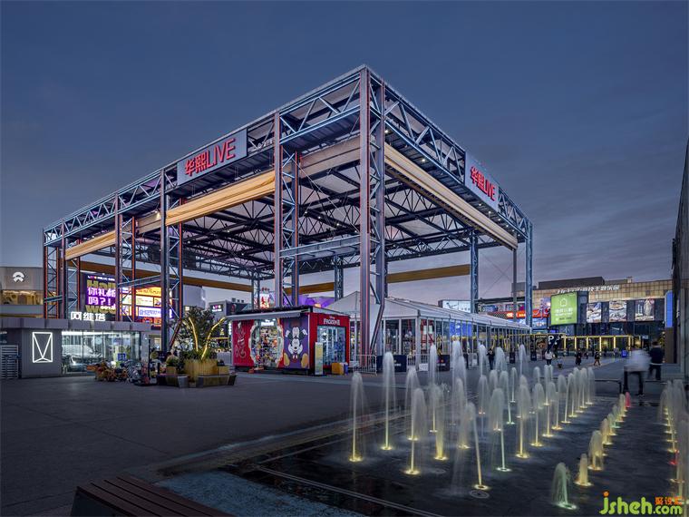 中心广场的核心是一座开放式钢结构框架,既作为大型活动的主会场,又是冬季趣味冰场的主要场地,灯光设计通过对钢结构整体轮廓的亮化设计手法使其在夜晚呈现出科幻效果。动态水景喷泉变幻出各种色彩,好似一场水与光的盛宴。周边店铺和摊位如散落的岛屿,烘托出开放而包容的商业氛围。