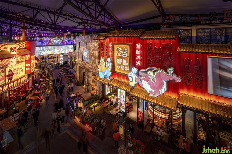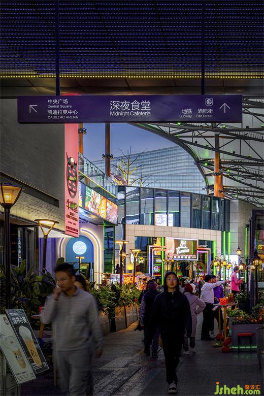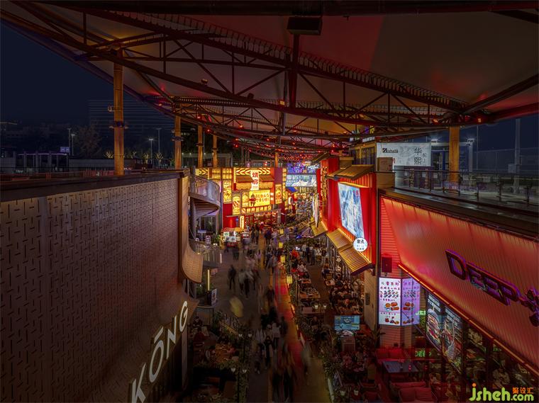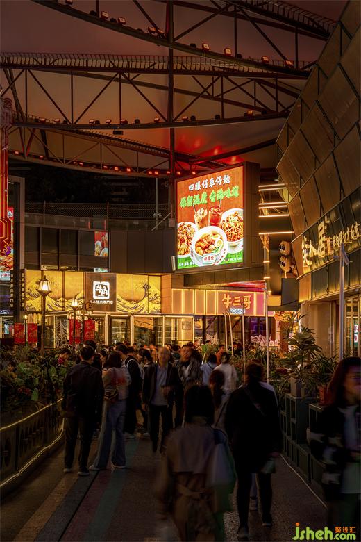 夜幕降临,酒吧街迎来了最璀璨的时刻。建筑设计以复古风格为主,红色灯笼、古色古香的屋顶和满墙的霓虹灯广告牌,无不散发浓厚的怀旧氛围。巧妙的布局营造人流动线和视觉焦点,人们不断被新的视觉元素吸引,保持着探索的兴趣。