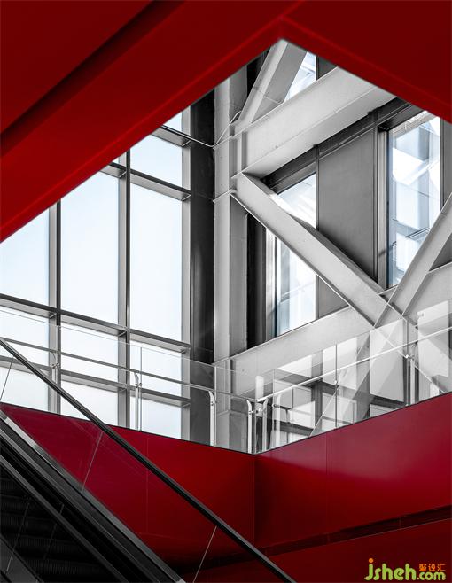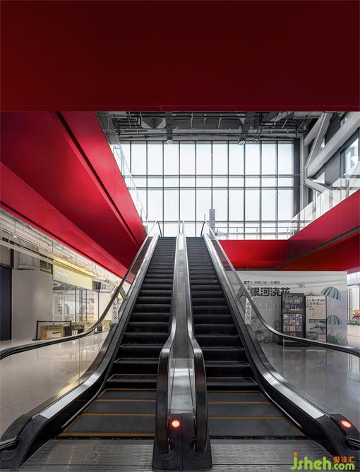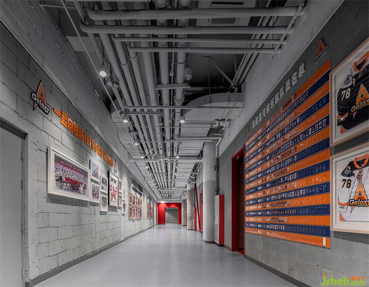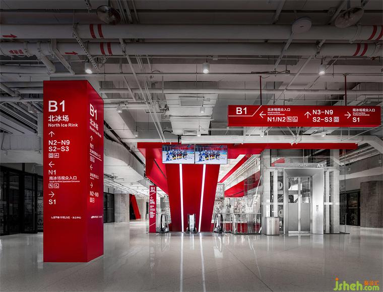 铝板、背漆玻璃等现代材料使内部简洁易用,确保建筑作为体育场馆的耐久性,从外部的品牌展示到内部的功能区域指引,导视系统全方位的覆盖了整个场馆,既提升了整体建筑的时尚气息也在材料和色彩策略上更为直观高效。