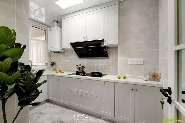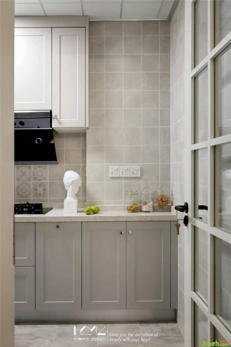 厨房装修公司保留了较大的操作空间,格子花砖与浅灰色柜体融为一体,银色的小圆把手让整体多了一份精致的味道,这样的厨房不显拥挤,适合夫妻俩齐齐下厨。