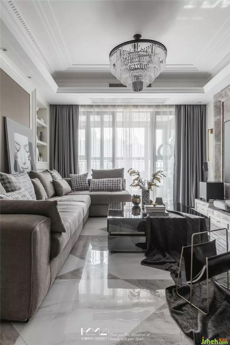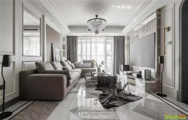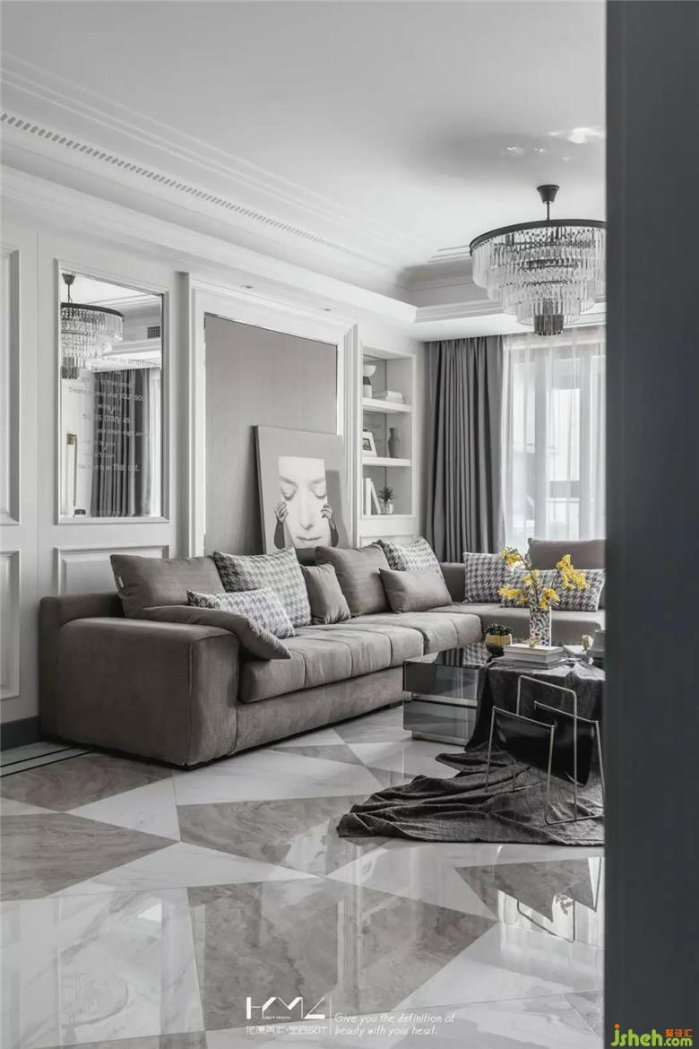 客厅地面地砖,选用了两种颜色纹理进行拼接铺设,设计了钻石切割的铺贴方案,高贵的材质感,体现摩登时尚的生活品质,即使家居生活中不铺地毯,也是让人赏心悦目的。