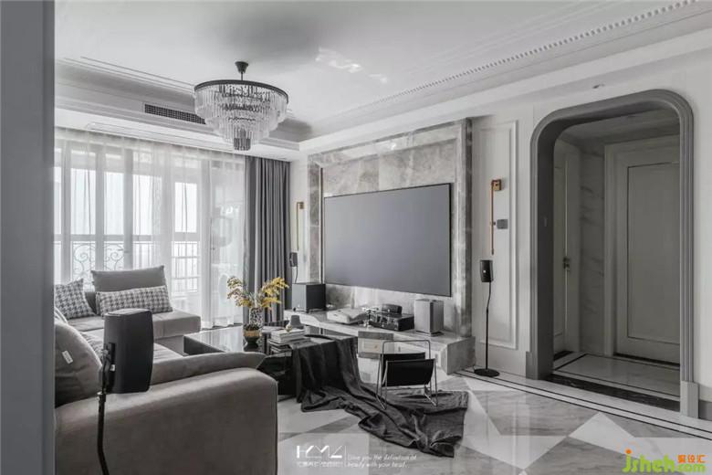 业主很喜欢新奇的电子产品,所以我们的电视机被100寸的硬屏投影屏幕所取代,电视背景墙采用简约的大理石剖切造型,将屏幕镶嵌其中,两侧白色简欧护墙板围合,金属长杆壁灯点缀,精致大雅。