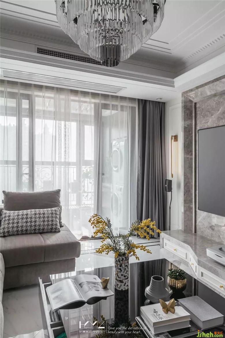 客厅沙发背景,整面简欧风格白色护墙,中间内嵌皮质硬包,银色不锈钢收边,两边做了玻璃镜面和展示开架的不对称设计,空间变得灵动起来。