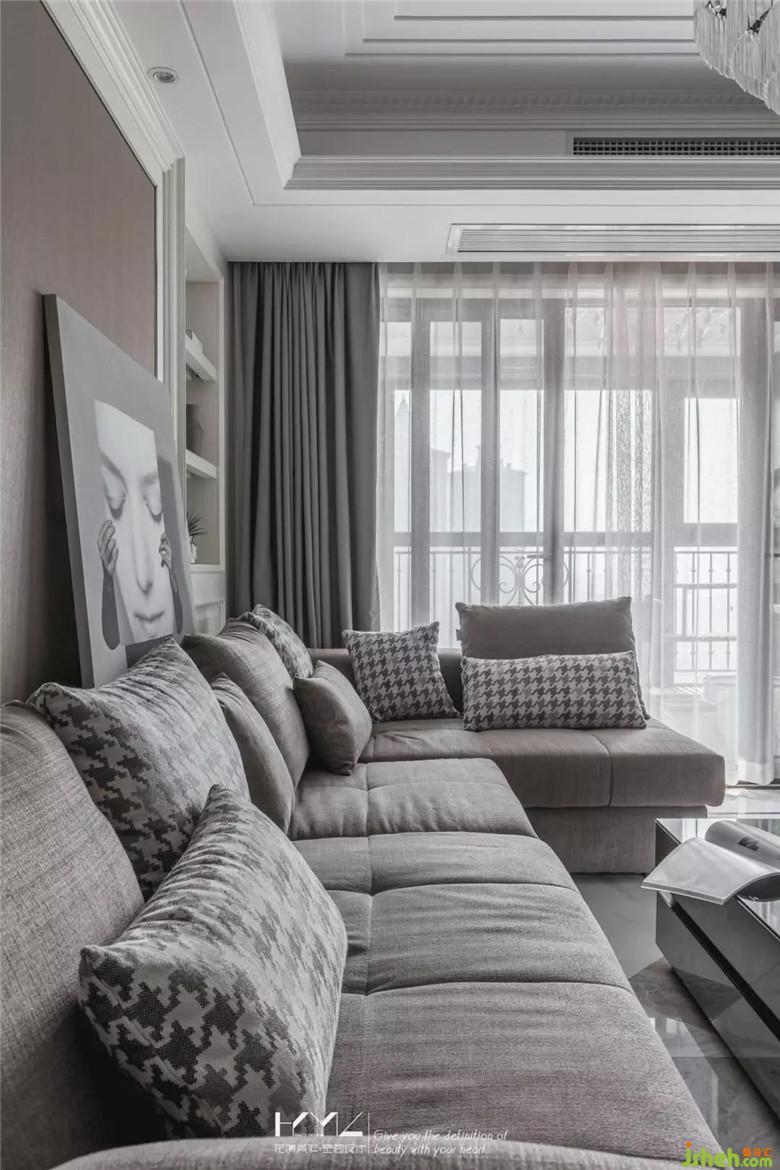 客厅有三个过厅,拱形门洞的造型加上高柱脚,电视背景这侧的与对面的正好是中轴对称的布置形式,三个拱形门洞瞬间提升了空间的高贵典雅的气质。