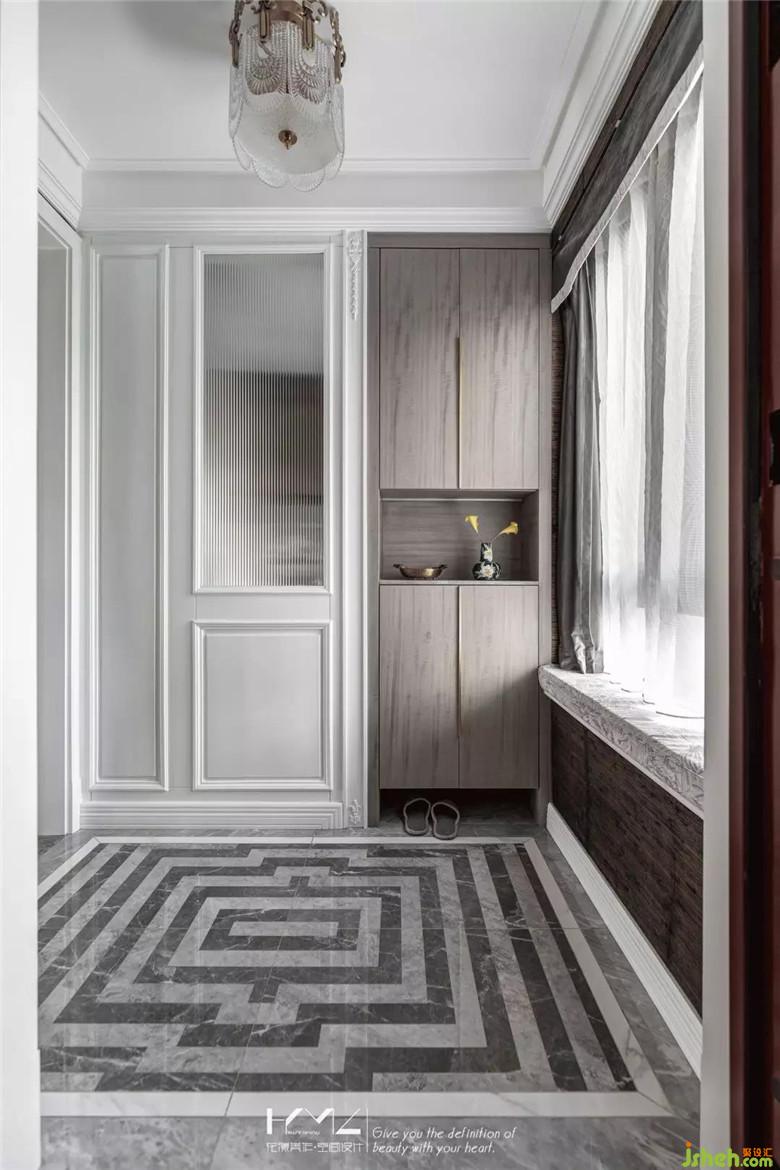 入户门厅地面立体回纹图形,后场切割双拼地砖,由四块组合而成,对面鞋柜,中层开放展架,随手放置钥匙和常用用品,下方悬空,方便日常更换的鞋子放置,柜门板特别选用了影木材质,质感细腻。