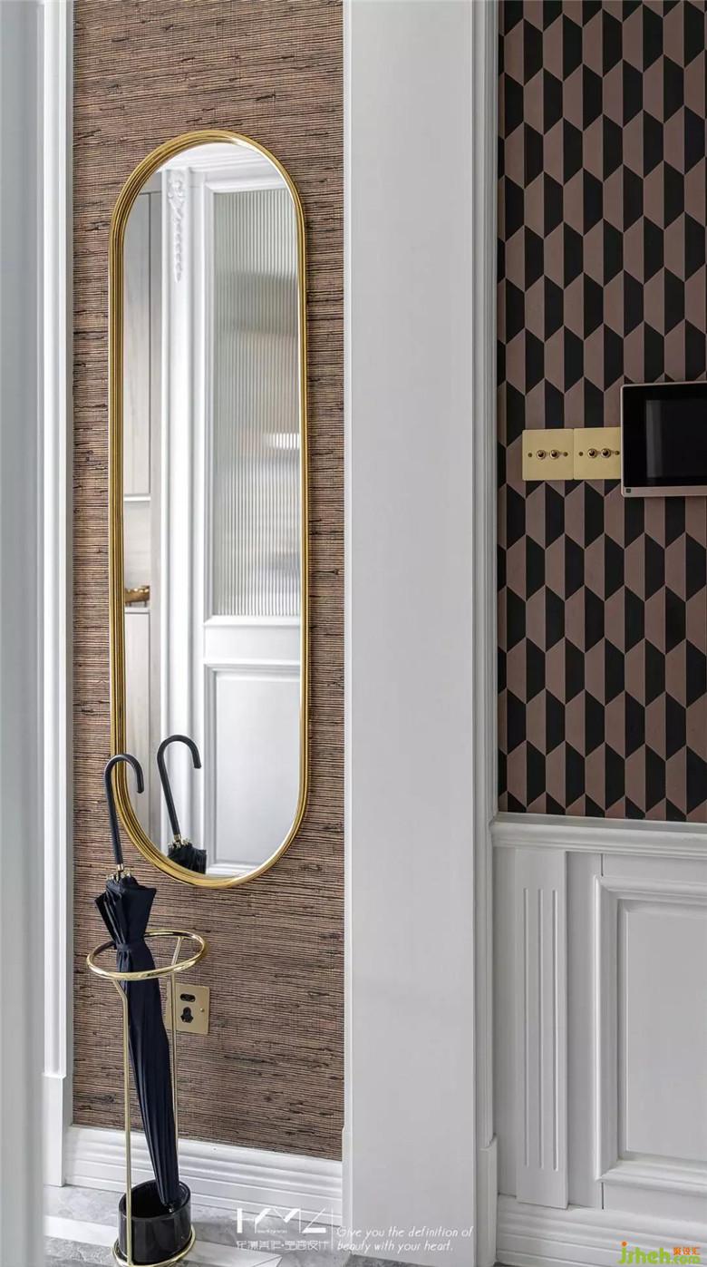 右手边的飘窗台面,定制软垫,当换鞋凳使用;正对的白色护墙面与长虹玻璃结合,隐约可以看到厨房;入户门右侧,金边全身镜和精致的伞架组合,随时整理仪表体态,大幅镜面,也同时拓展了入户小空间的视觉,复古造型的顶灯,增添门厅浓郁的仪式感和庄重感。装修公司