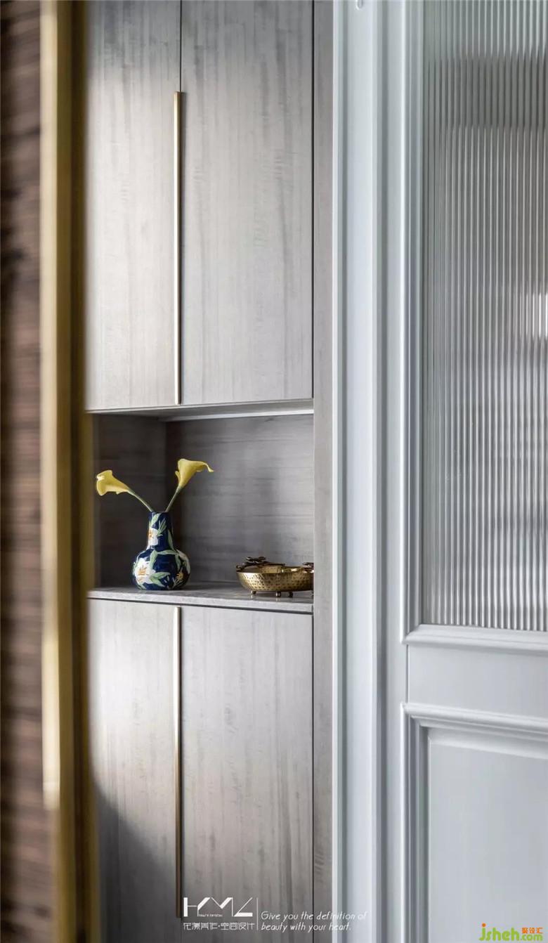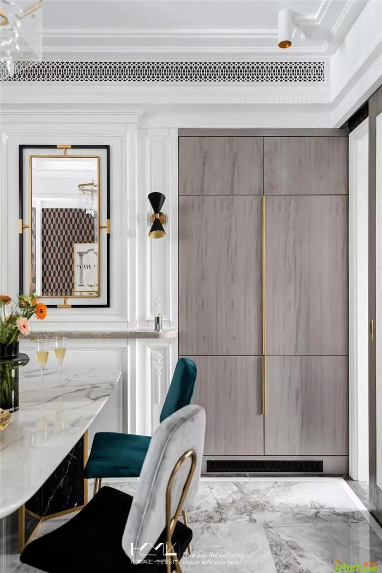 功能上,腰线处弧形大理石条板挑出,可放置装饰品或者餐厅常用物品;冰箱亦放置在了餐厅,且作了隐形处理,与墙面护墙完美融合,与入户鞋柜柜门,使用了同样的影木材质,搭配香槟金色长把手,简约精致。厨房定制了吊轨移门,大块面的长虹玻璃嵌入,保证了餐厅的采光充足。