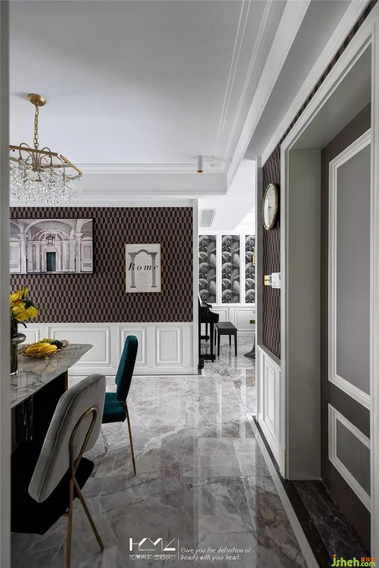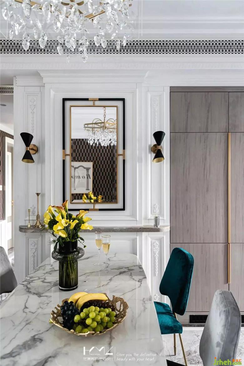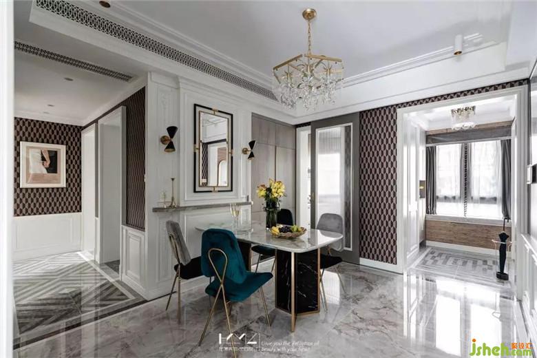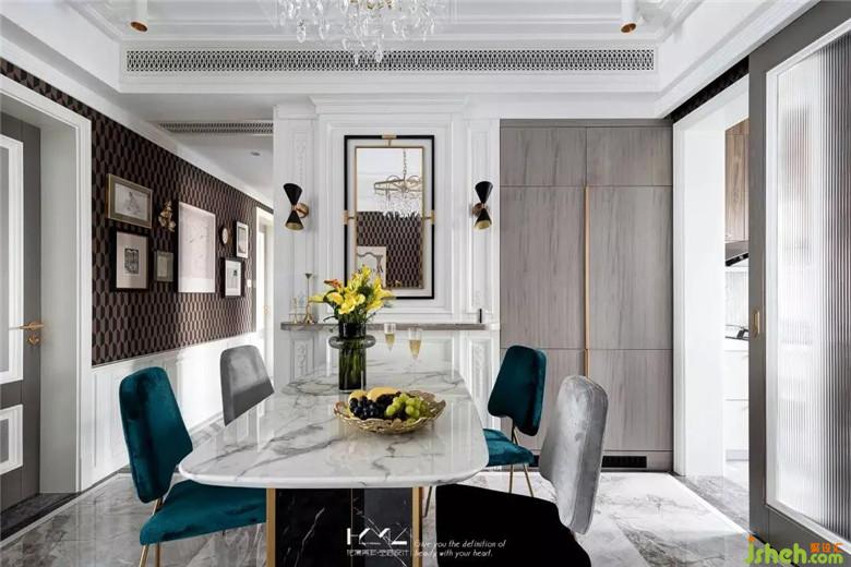 配色上,餐椅的配色与客厅沙发配色呼应,湖水绿/黑灰的丝绒与金色细腿结合,餐桌则是黑白大理石的组合,壁纸则是英国cole&son的几何系列,型号是112/5022,这种明显的上下色块区分,明暗有序,创造出一种低调复古的优雅感,同时丰富空间层次细节,护墙的分割比例细节组合提高了空间尊贵的调性。装修公司