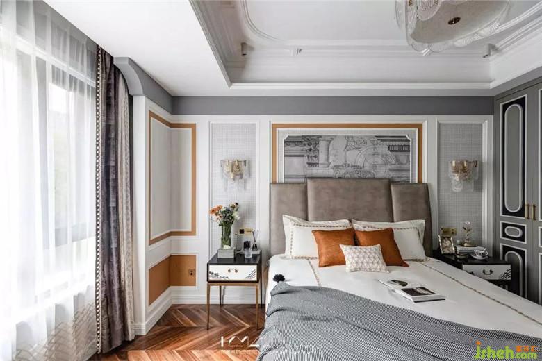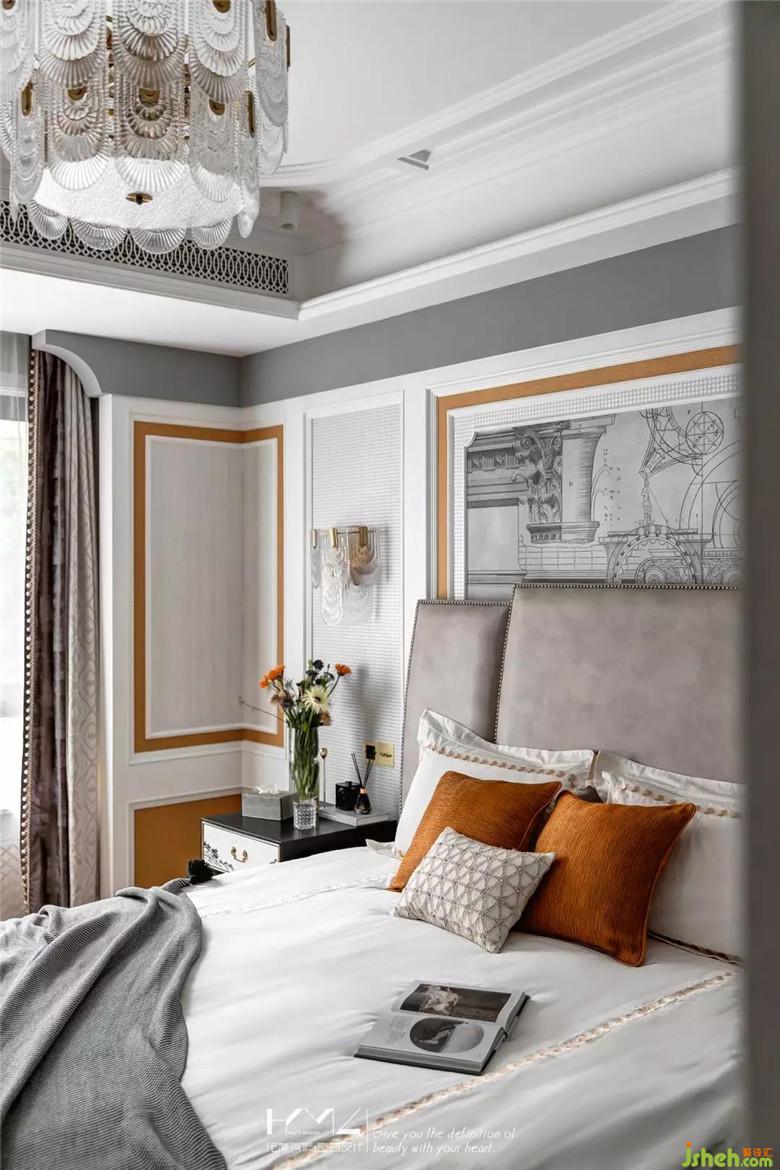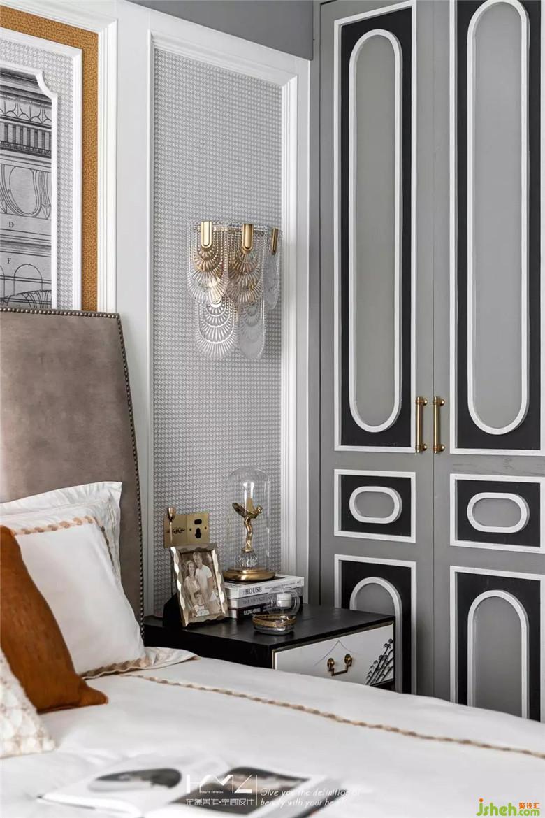 皮革铆钉的高背床,尊贵而又怀抱安全感,中式复古的床头柜打破界限的存在我们美式空间里,中西合璧贯穿始终。