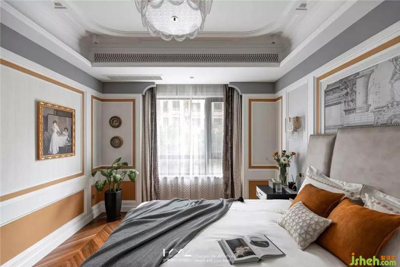 主卧整体理念是优雅,尊贵,以浅灰奶白为主色调,局部点缀橙色,褐色,深灰,地面均选用深胡桃木实木鱼骨地板,墙面主体造型是分三个层次,外框是实木奶白烤漆护墙板,内框pu线条,选用橙色纹理,千鸟格,香槟色素纹,以及古建筑手稿的背景壁画等四款壁纸组合布置,形式和配色让空间更加立体,层次更加丰富,细腻质感将优雅尊贵气质体现的淋漓尽致。