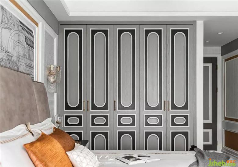 主卧衣柜柜门,与房门设计分割异曲同工,不过,柜门配色以重色为主,白色框线点缀,融合圆弧元素设计其中,彰显沉稳气质。