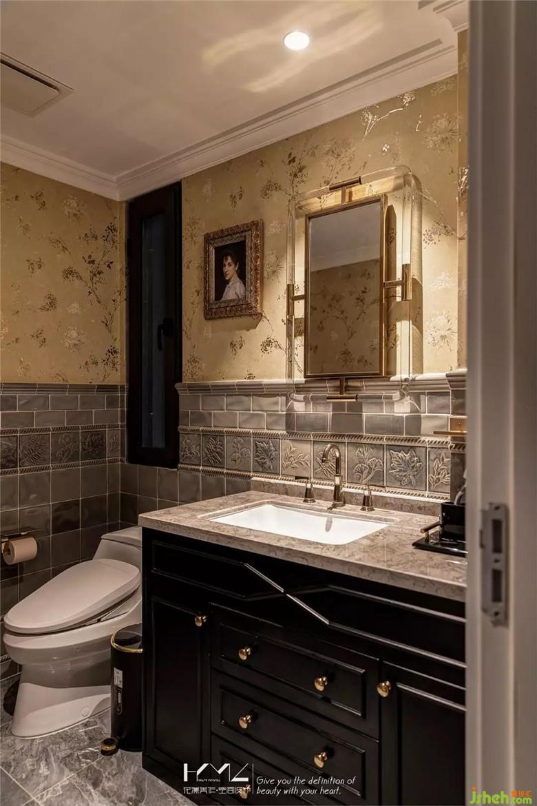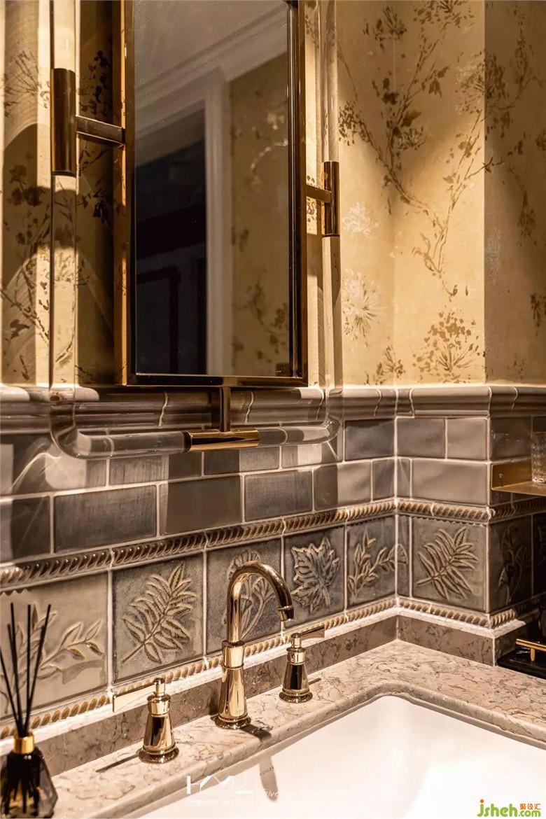 主卫的设计,根据业主要求,没有设置淋浴功能,地面装修公司选用深灰色系的砖与半墙仿古拼花砖搭配,上半部分,搭配香槟色系花纹墙纸,枝叶都是金箔反光质感,让主卫空间融入整体,弱化了常规卫生间的冰冷感。