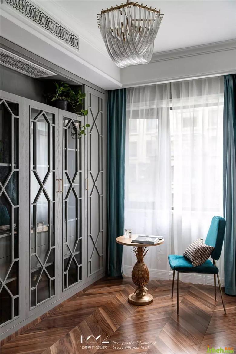 书房功能上当做藏书与储存空间存在,利用L型结构特点,围合出衣帽柜和书柜组合,全部灰色显纹烤漆饰面,柜门设计了菱形凹凸造型,衣柜与书柜利用中间镂玻璃区分,上方的空调风口,利用柜体设计,将回风口置于书柜上方,简约水晶吊灯,与蓝色丝绒窗帘营造轻奢氛围。
