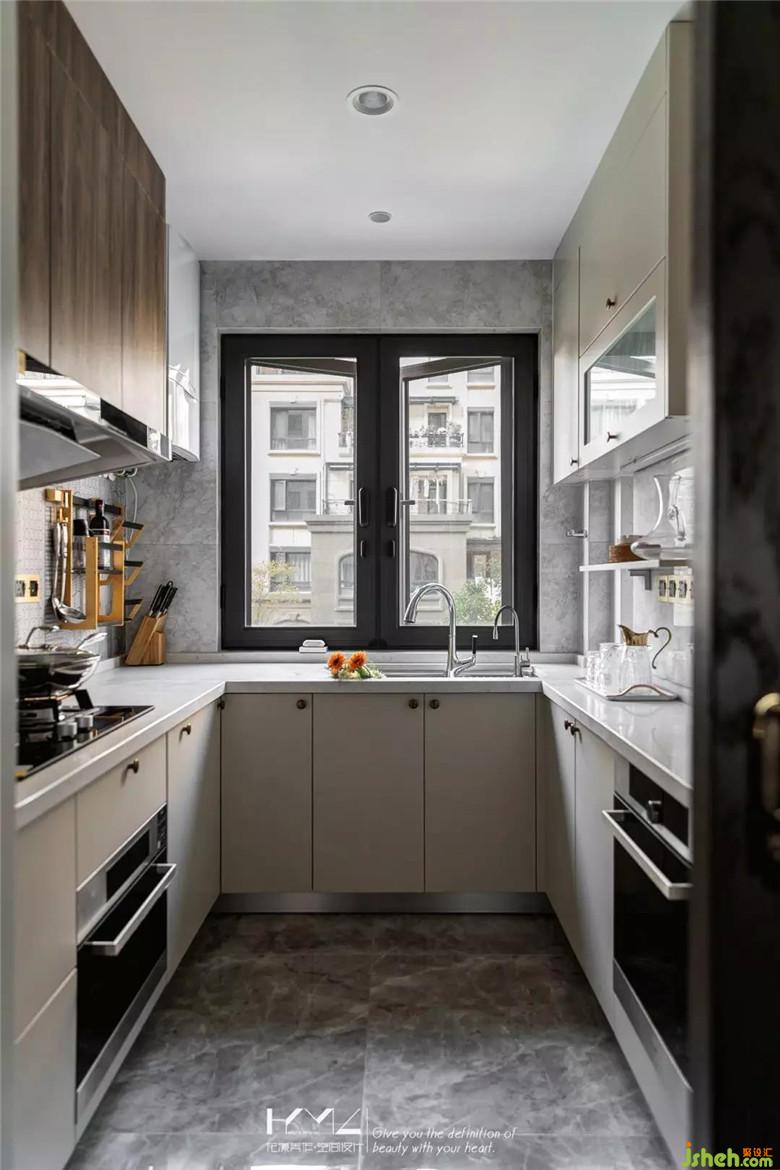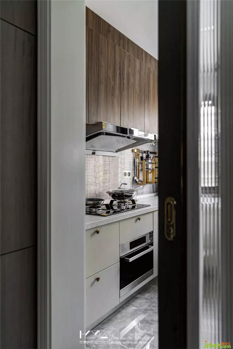 厨房呈现现代风格,吊柜深胡桃木平板门颜色与整屋的鱼骨地板类似,配亚克力把手,下柜是奶白色烤漆门板,金色把手点缀,灶台的背景砖选了四色混拼花纹长条砖,与南阳台同系列,地砖与主卫地砖同款,厨房内的五金挂件都是黑金色,所有软装的选择都透露着精致的小心思。装修公司