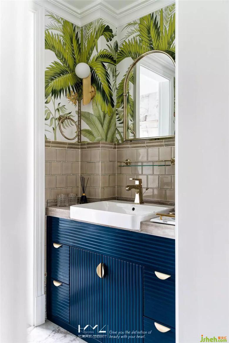 上部分是绿色系的花鸟壁纸,柜体特意调了藏蓝色烤漆门板,横向竖向的抽缝纹理让柜门显得独特雅致,半圆的金色把手可爱又独特,两边是金色白球壁灯。