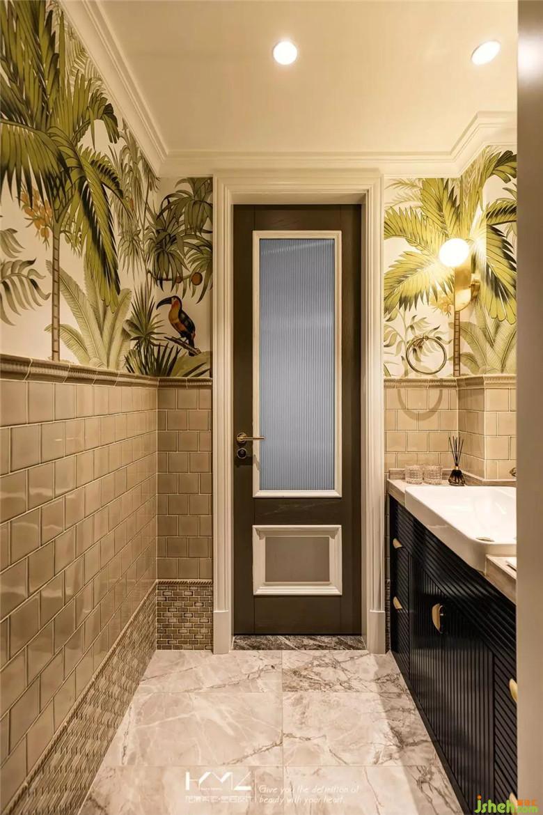 干区设计手法与主卫相同,半高复古小砖的拼贴形成了保护墙裙,美观易打理。