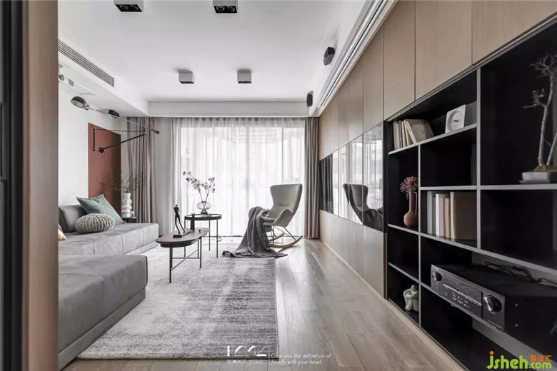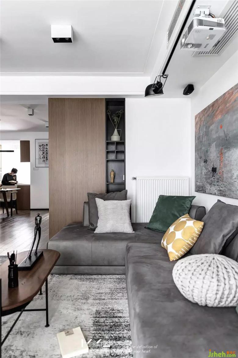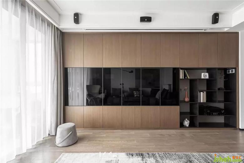 屋主一直有读书的习惯,希望能营造家庭读书的氛围,而客厅是整个家最核心的区域,读书、藏书的功能在这个区域可以发挥的淋漓尽致。投影幕布代替电视机,释放柜体空间,整排书柜既实现了书籍的放置,装修公司也解决了收纳的问题。书柜的木质柜门仿照KD板的颜色和木纹做油漆门,反复调色确认,尽可能缩小色差,统一木色。