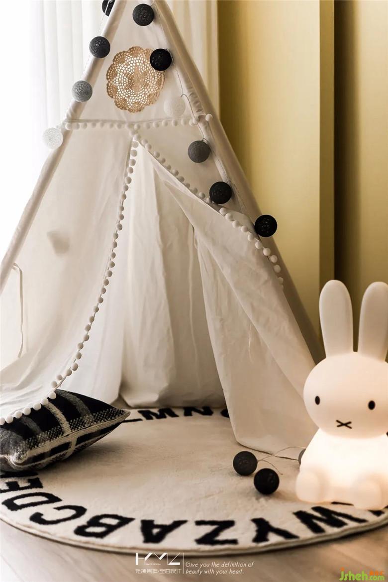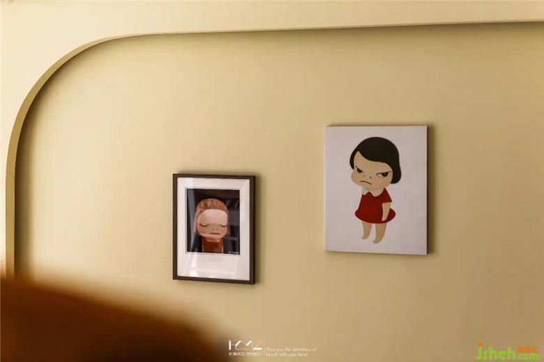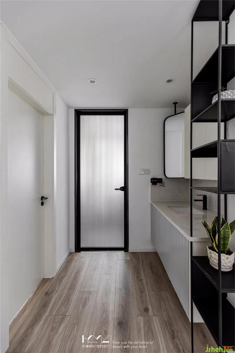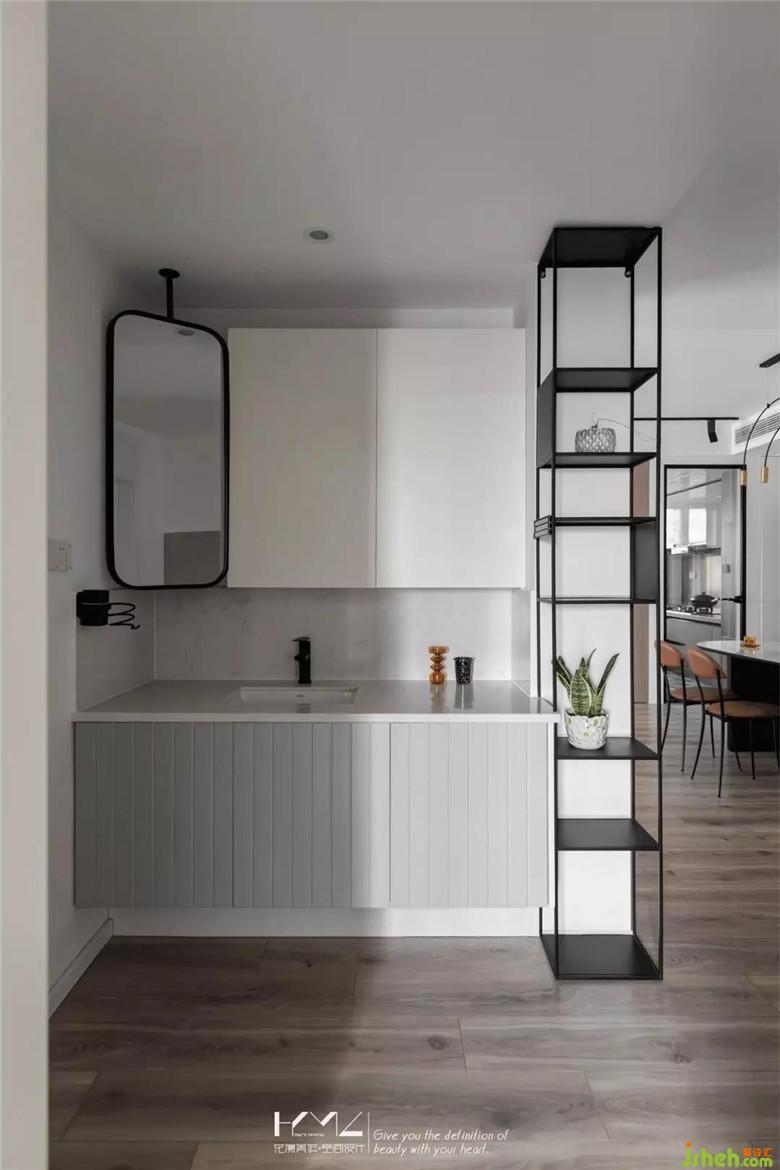 干区为了避免出主卧门就看到镜子,采用了吊镜45度斜装的方法,同时又兼顾了墙面的储物柜。右侧定制的黑色置物架既添加了干区的收纳,又起到了展示和美观的作用。