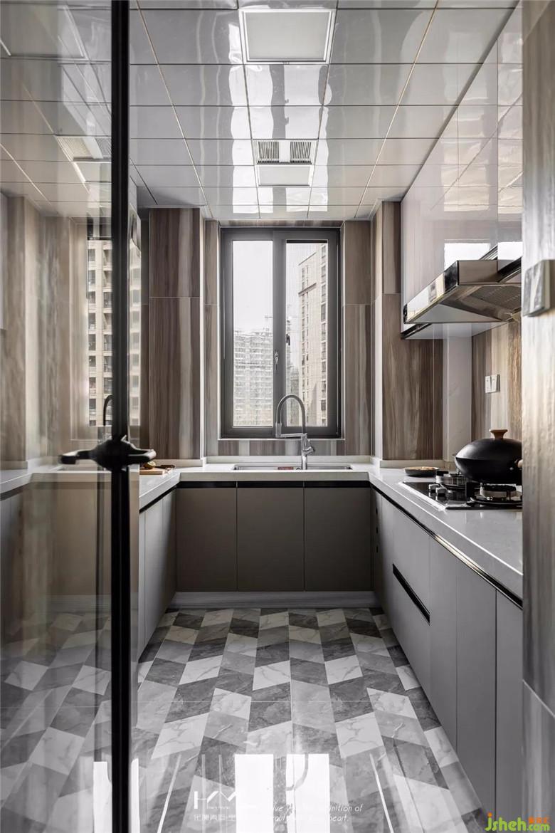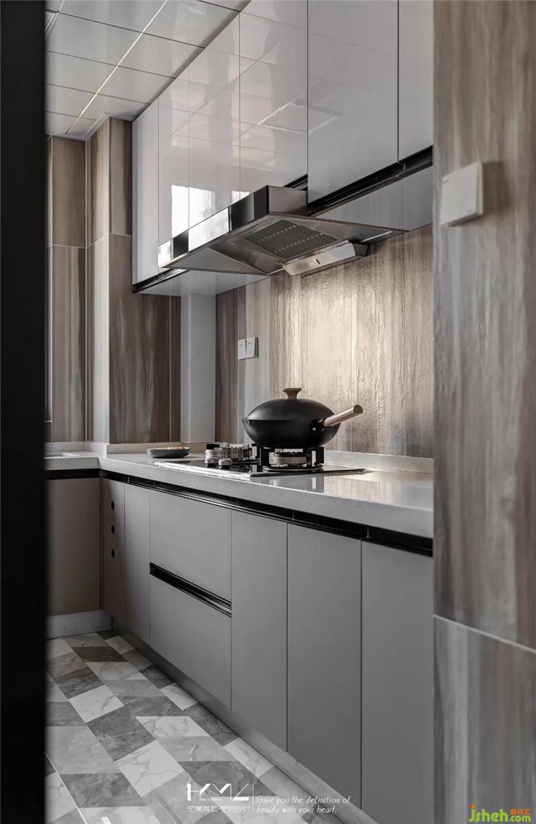厨卫都采用灰色调为主的砖及柜体,厨房墙面的木纹砖纹理清晰自然,又易于打理。