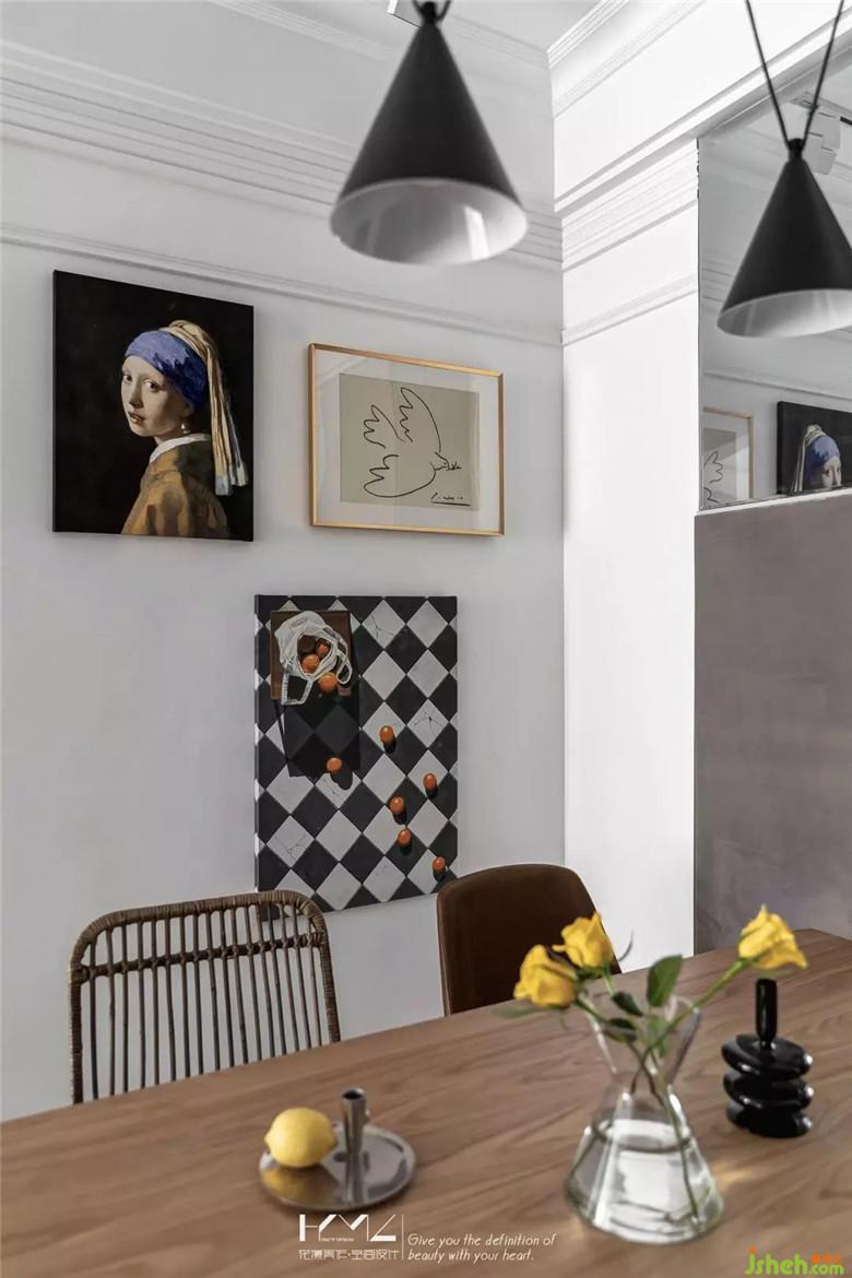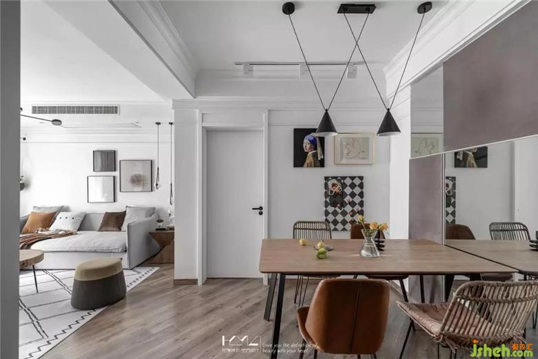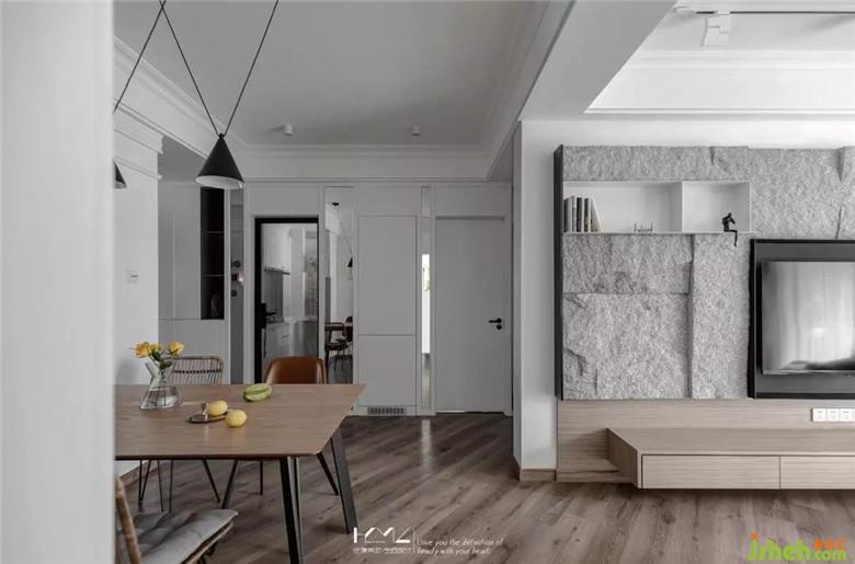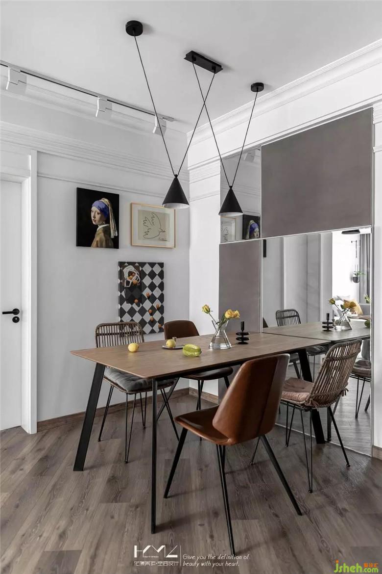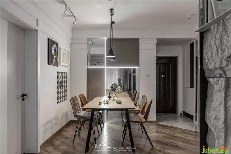 餐厅与门厅装修公司利用了镜面元素来扩大空间的视觉感,餐厅背景的硬包既是装饰作用,又巧妙隐藏了强弱电箱,十字灯条增加了餐厅区域的亮度与装饰性。入户45度斜铺的地板贯穿客餐厅,个性十足。