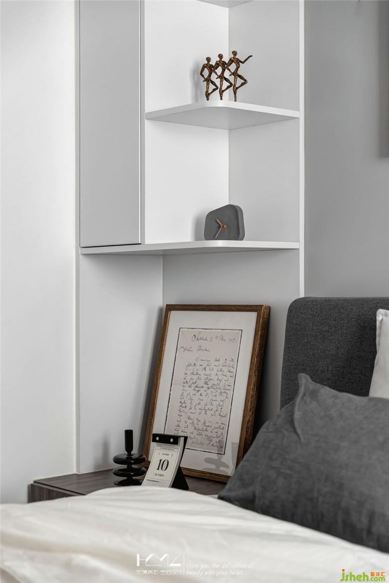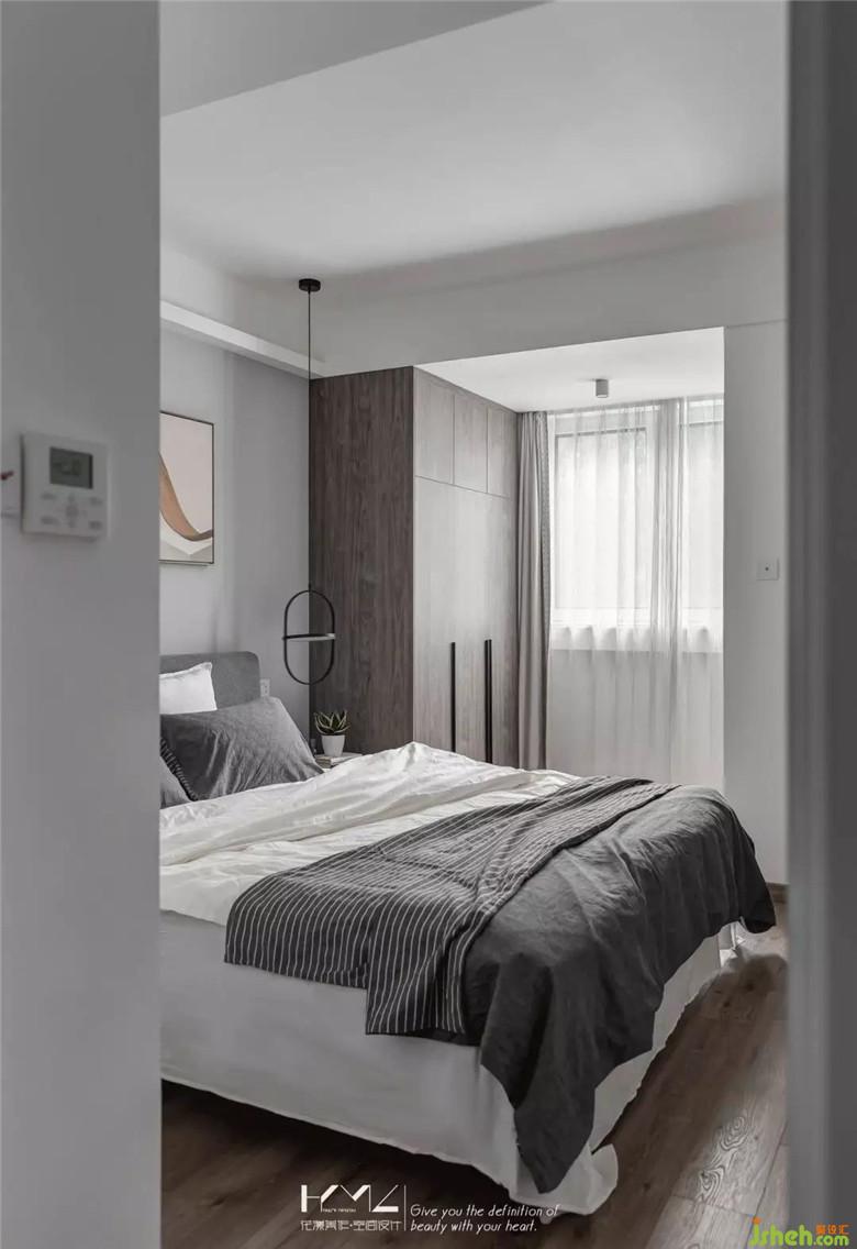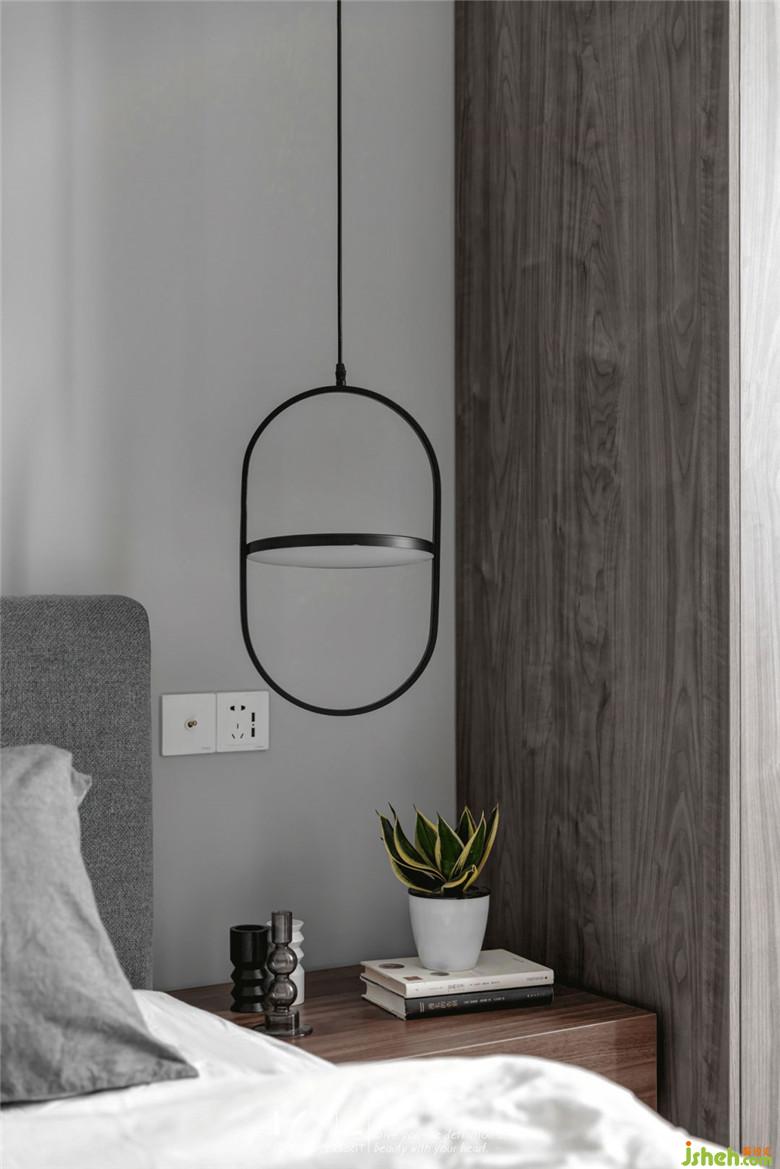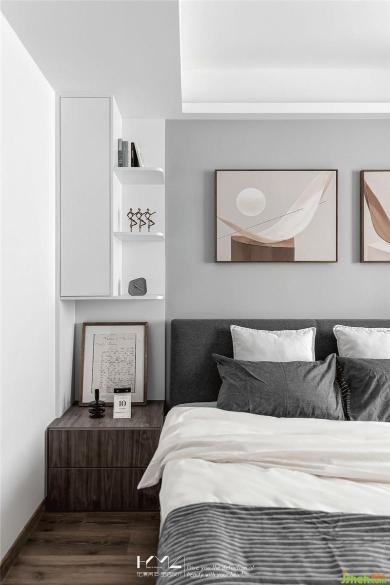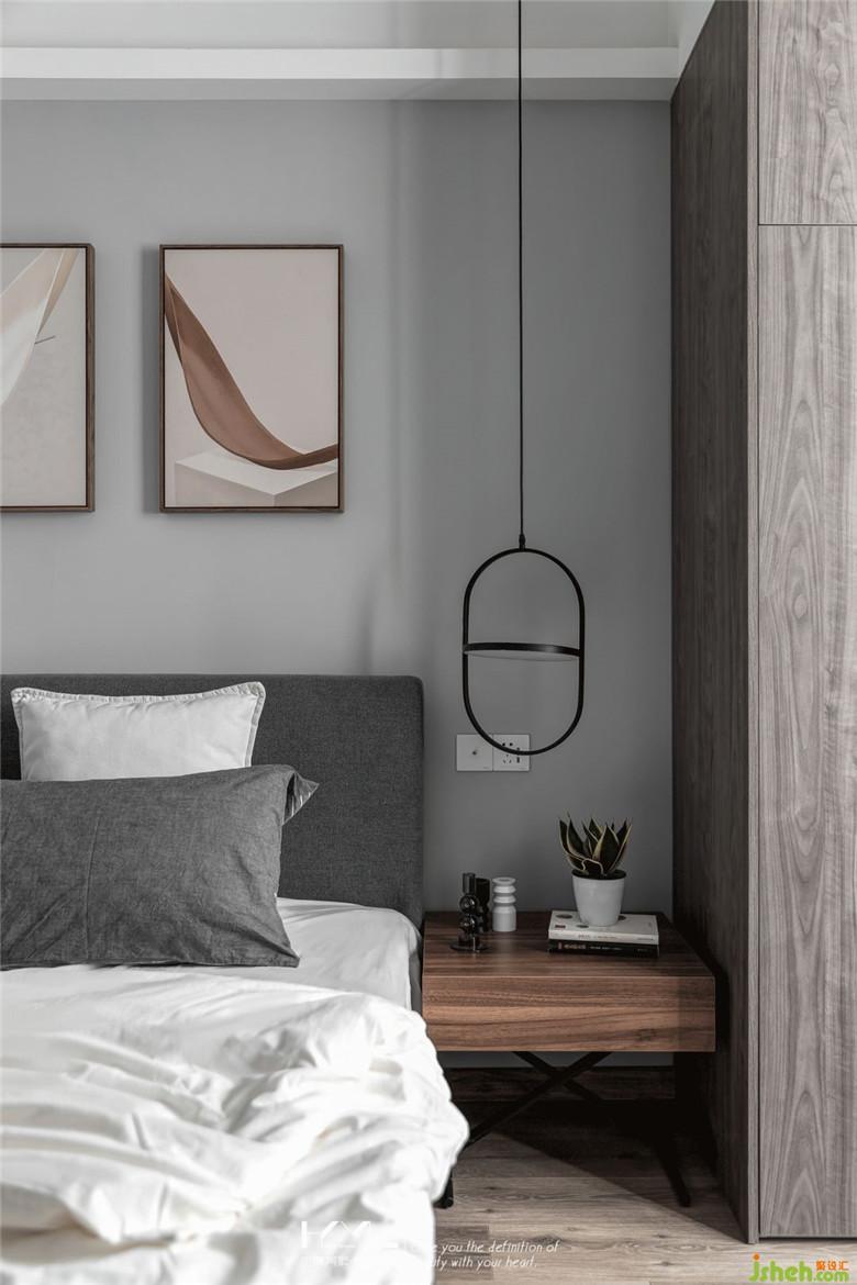 主卧整体格调偏沉稳,胡桃木的柜体、深灰色的床体和浅灰色的背景搭配白色的墙面,空间呈现一种简洁、利落的清爽感,床品和床更是融为一体,素色的纹理更凸现空间的气质。