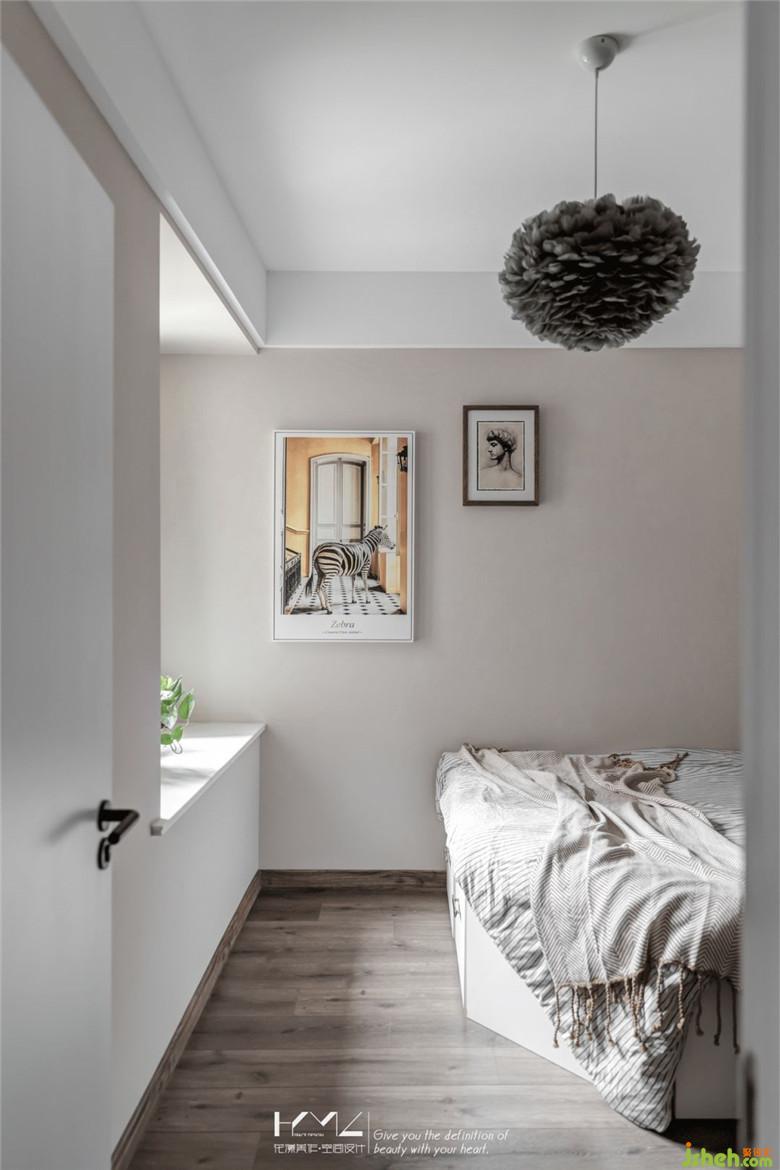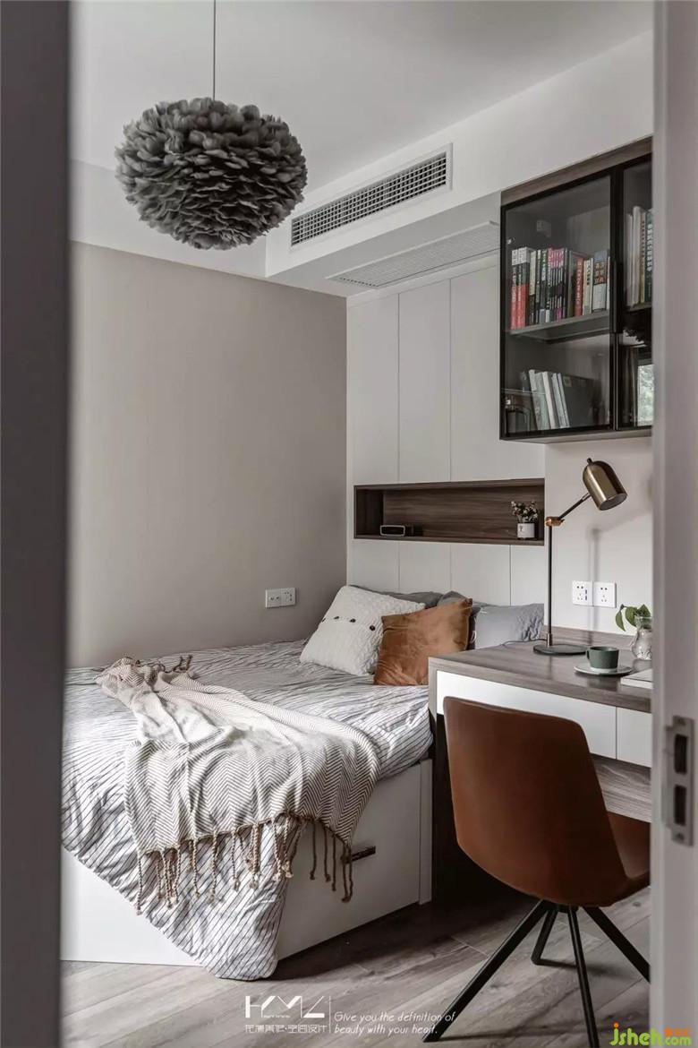 次卧装修公司整合了睡眠、休闲、储物、办公的功能,咖色的墙面与厨房瓷砖的颜色相呼应,北欧风的床品提升了空间的温馨度,胡桃木色和黑色点缀了整个空间。