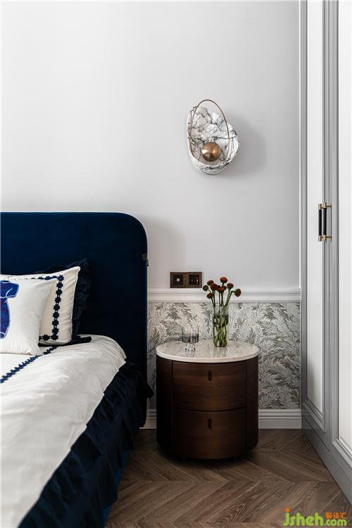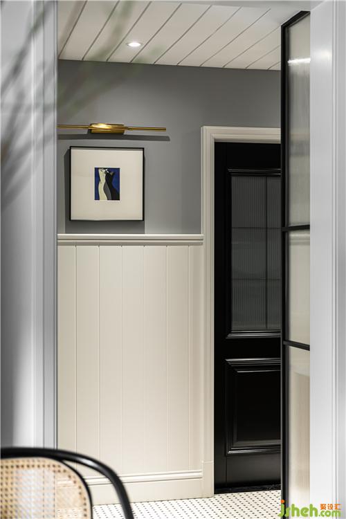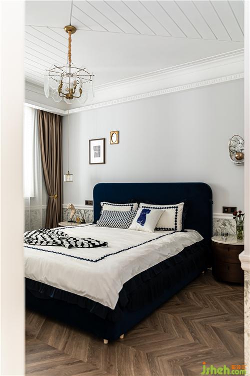 次卧顶面使用了和厨房、干区墙面相同的抽缝形式,