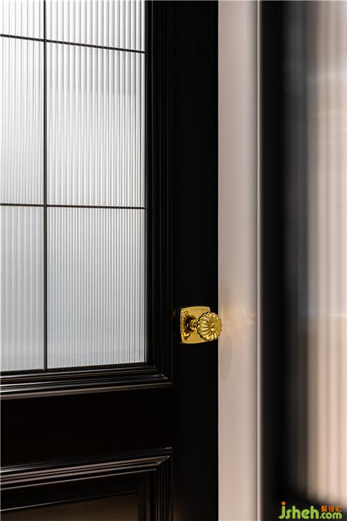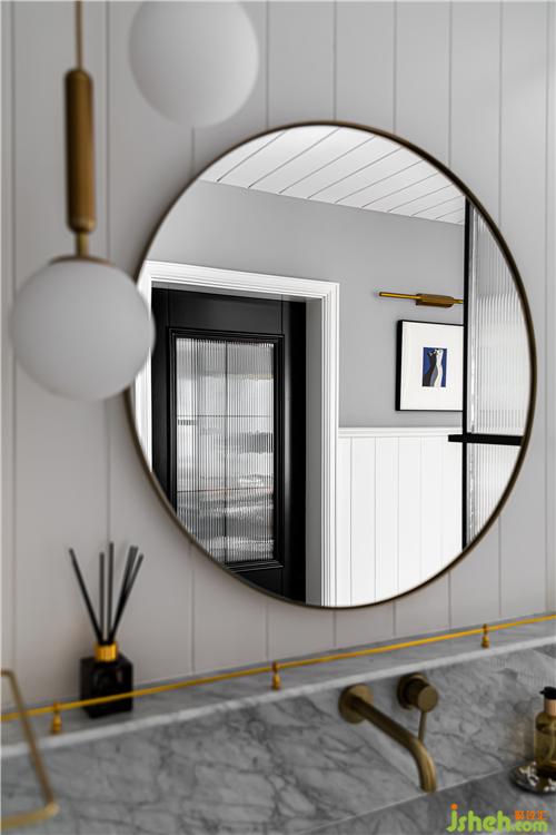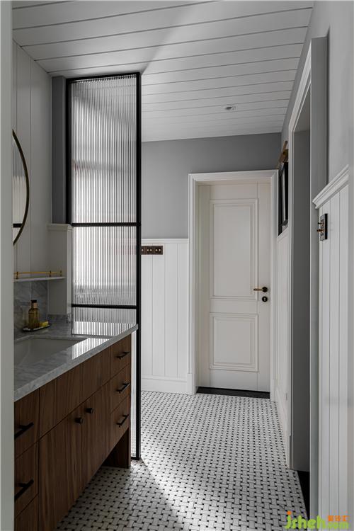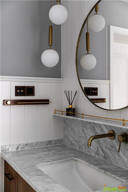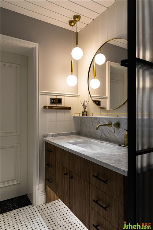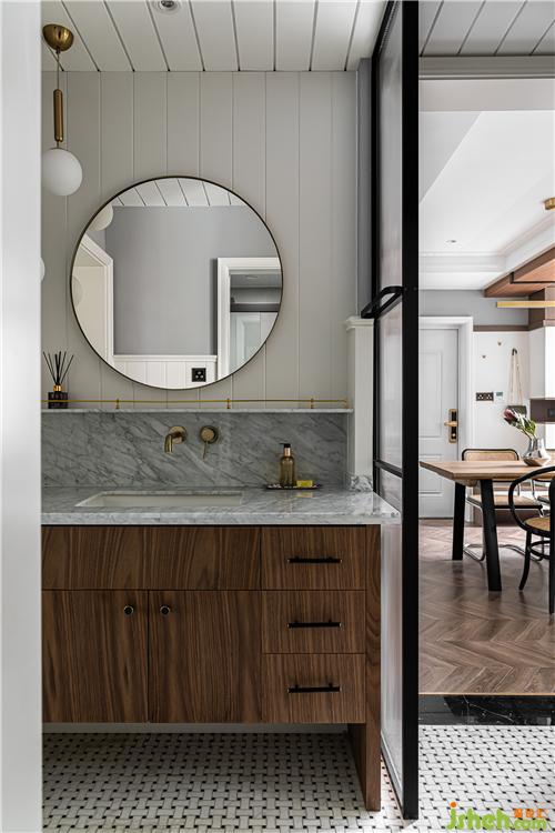 金属卫浴用品与胡桃木色的碰撞使干区空间尽显精致