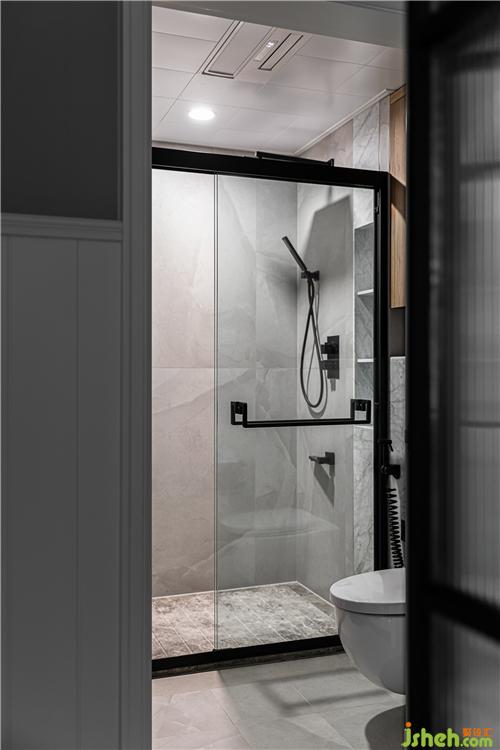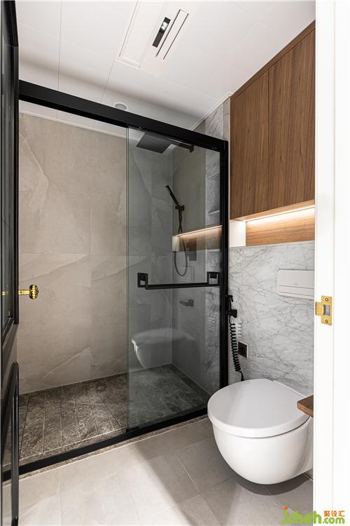 卫生间使用易打理的灰色墙地砖、石材,搭配木色柜体,简约而舒适