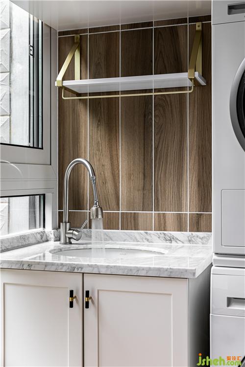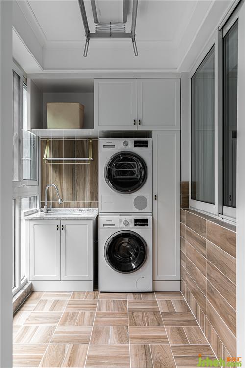 阳台依然延续木色系,白色柜门与设备融为一体