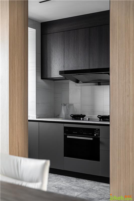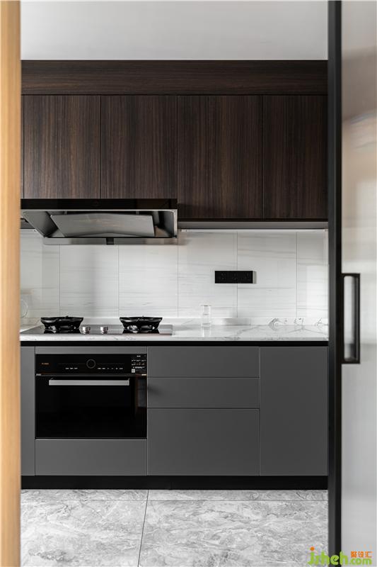 厨房与餐厅相互贯通,设置暗藏玻璃移门,可大敞大开,亦可将二者区隔开来,杭州家居装修设计每一处设计都是功能和美感上的考究。