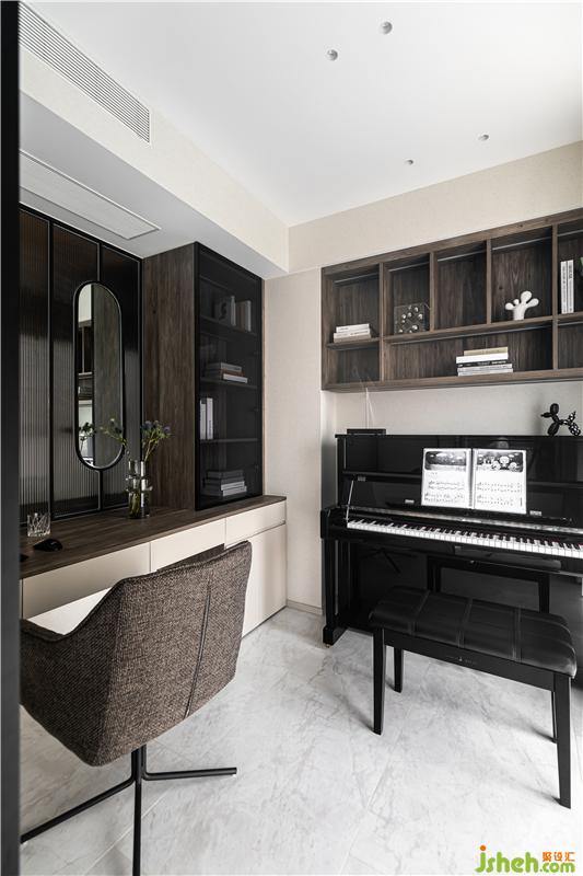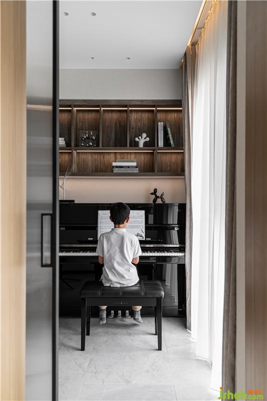 一字型双人书桌与书柜横竖交错,满足同孩子伏案作业,亦能满足独自使用书房,钢琴上方的开架书柜不同比例切割,蕴藏着对简约美学的严谨思考。